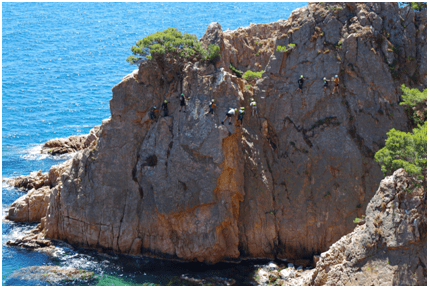 Tot resseguint la línia de la costa, arribarem a un sortint on es troba la Cala Molí. Aquí hi ha la possibilitat de fer una “via ferrada” ben equipada vorejant els penya-segats que envolten la cala. Mentre fem el camí ens trobem un grup d’intrèpids fent la via ferrada.