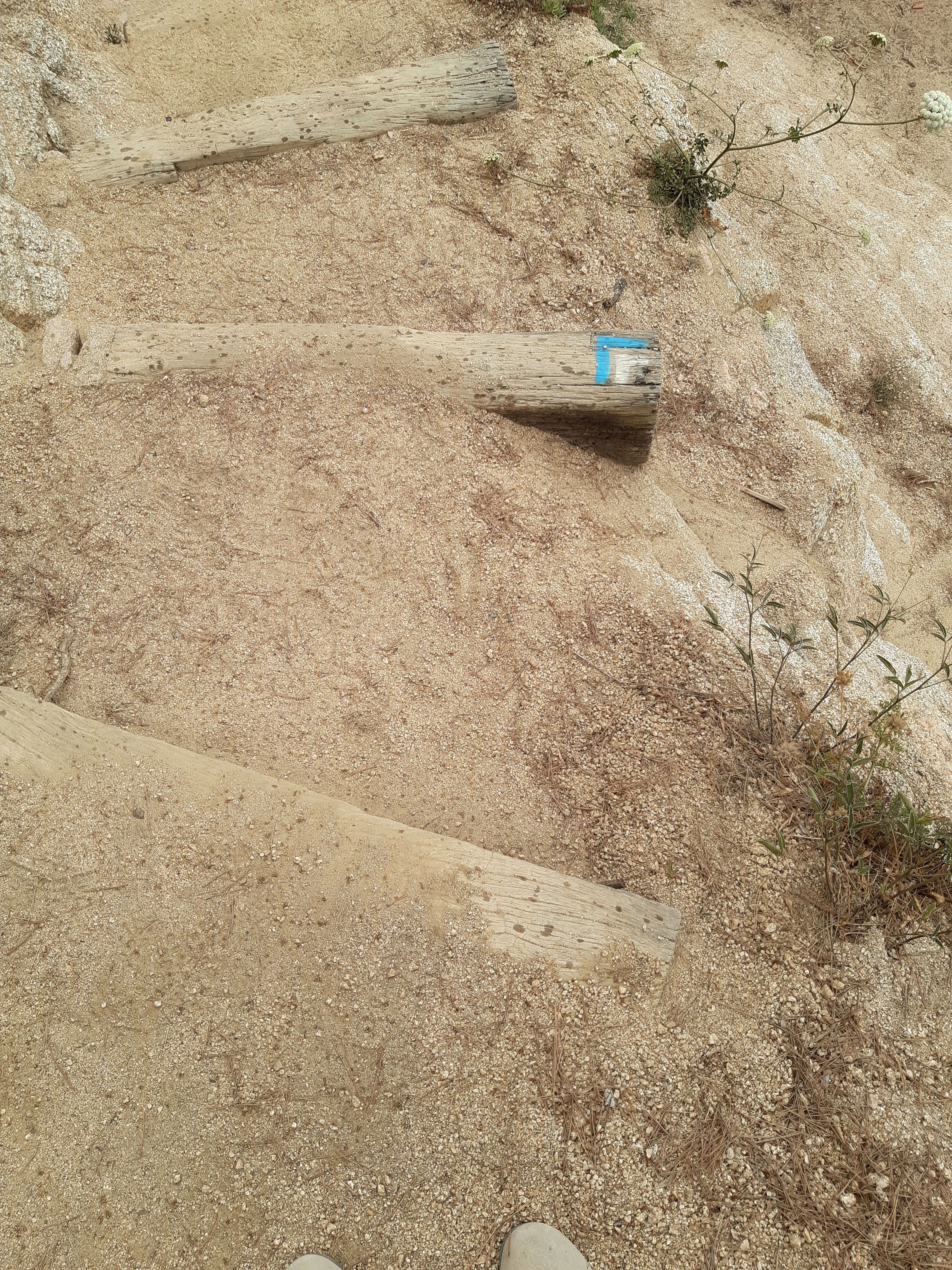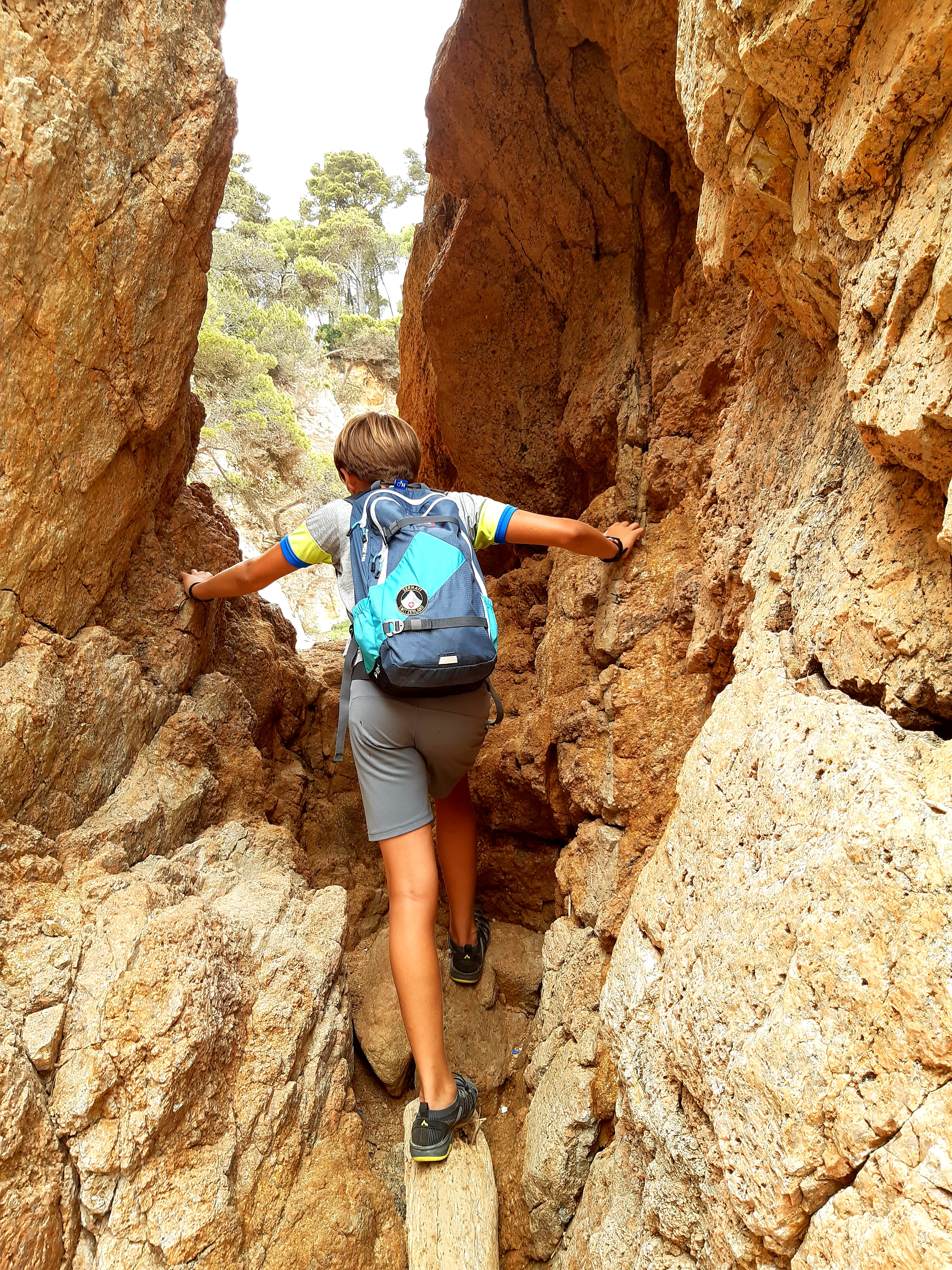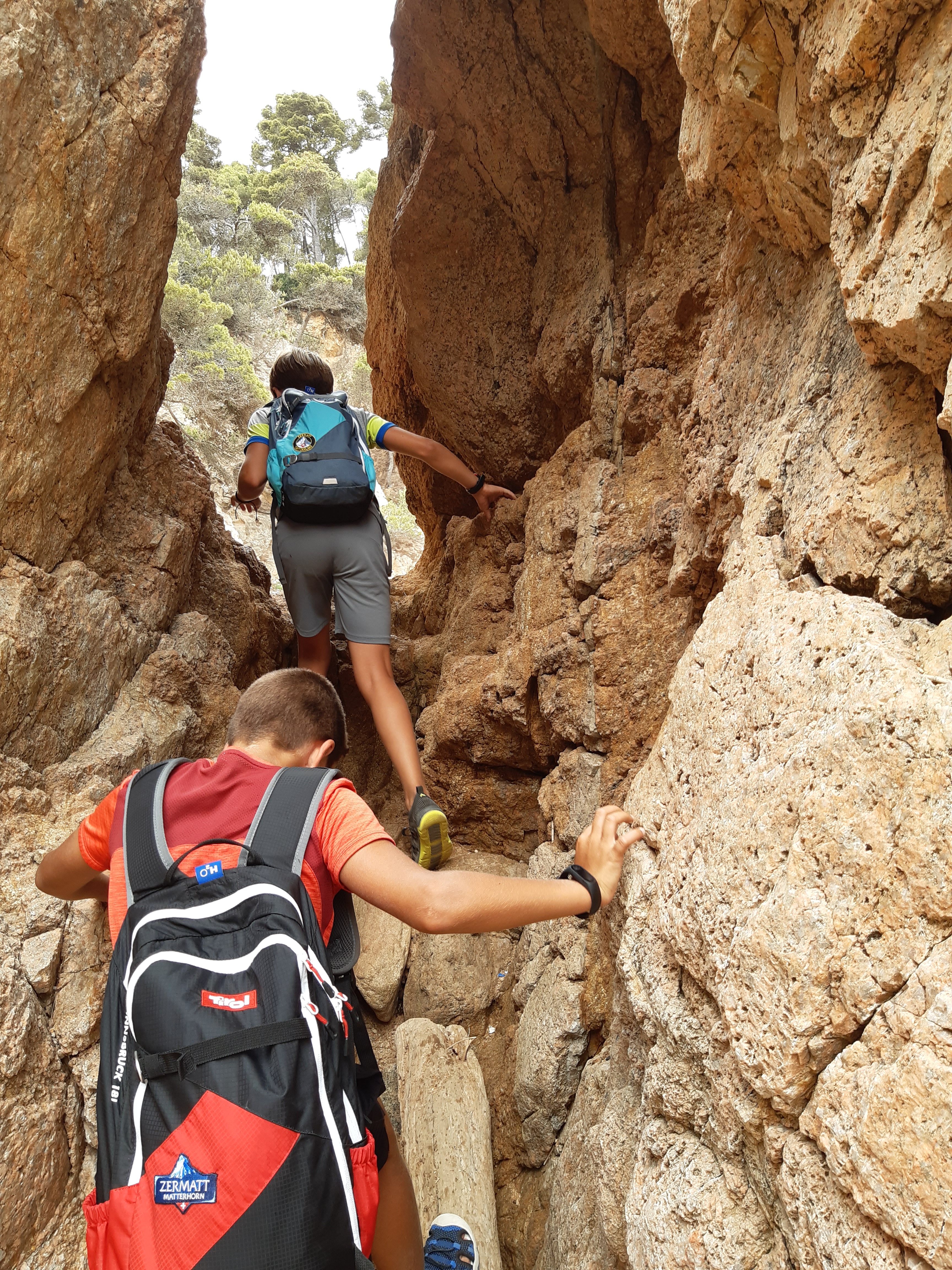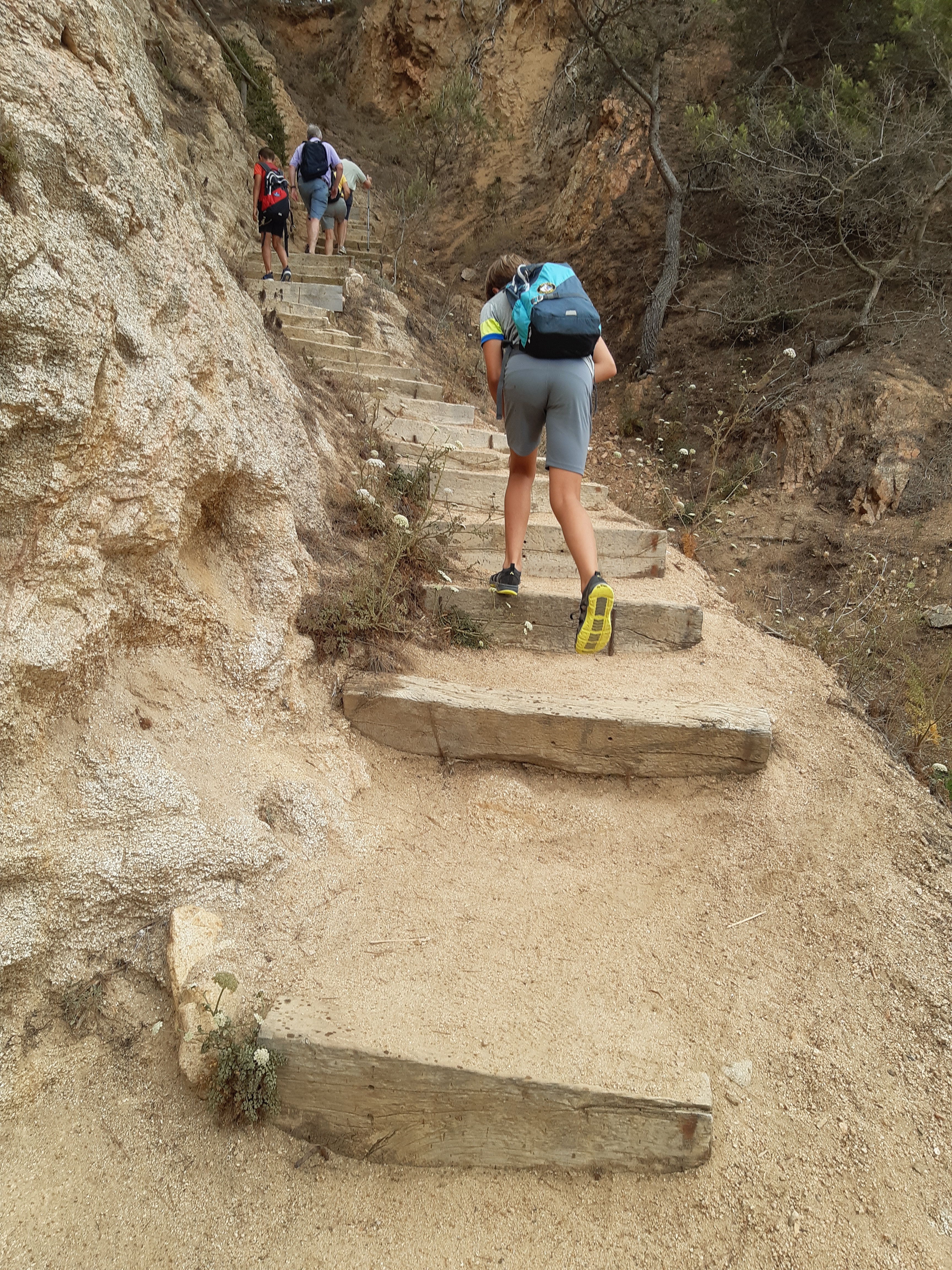 A mig camí de la cala, trobarem unes escales una mica amagades que s’enfilen de valent. ❗Vigileu perquè nosaltres no les vam veure i vam continuar per la Cala el Crit fins que quan portàvem 5 minuts escalant per les roques a tocar de mar ens vam adonar que aquell no podia ser el camí. Vam retornar les nostres petjades fins que vam veure gent que pujava per unes escales. Us trobareu unes marques blaves i blanques pintades als esglaons.
