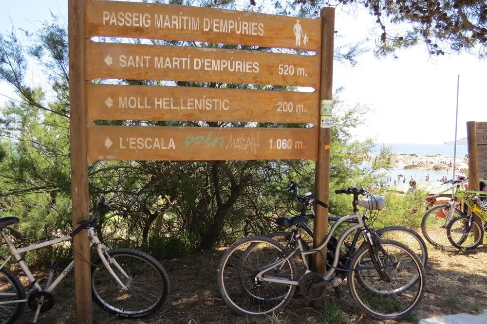 Caminarem uns 200 m per la Ronda del Pedró i allà, on trobem l’Ampadòfor (monument de la flama olímpica ) trenquem a la dreta per agafar el passeig d’Empúries. Aquest passeig, per a vianants 🚶♂️ i ciclistes 🚵♂️, té una llargada de 2’5 km i és paral·lel a les platges d’Empúries.