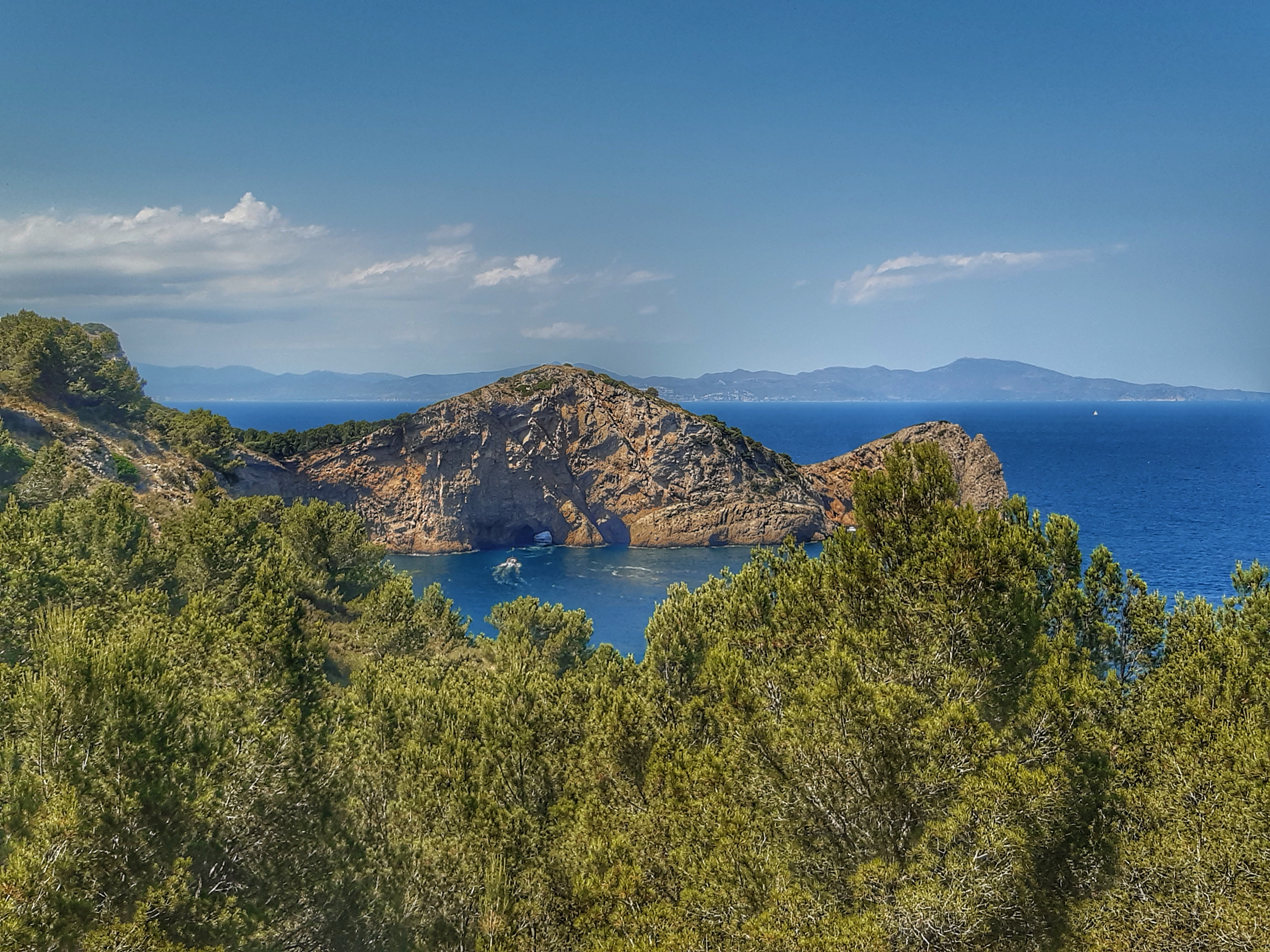 Ara ens tocarà agafar el camí que surt de l’altra banda de la cala i que puja dret pel mig de la pineda. Per no perdre’ns seguirem unes marques blaves o les del sender local. Aviat guanyarem alçada i el nostre camí es farà més planer. Uns metres després trobarem un altre senyal que ens indica el corriol amb marcada baixada cap a Cala Pedrosa. A mig camí de la cala, a la nostra esquerra ens trobarem amb un esplèndid mirador 😍 de la Foradada, la cova marina del massís del Mongrí amb un forat que poden atravessar les embarcacions 🚤.
