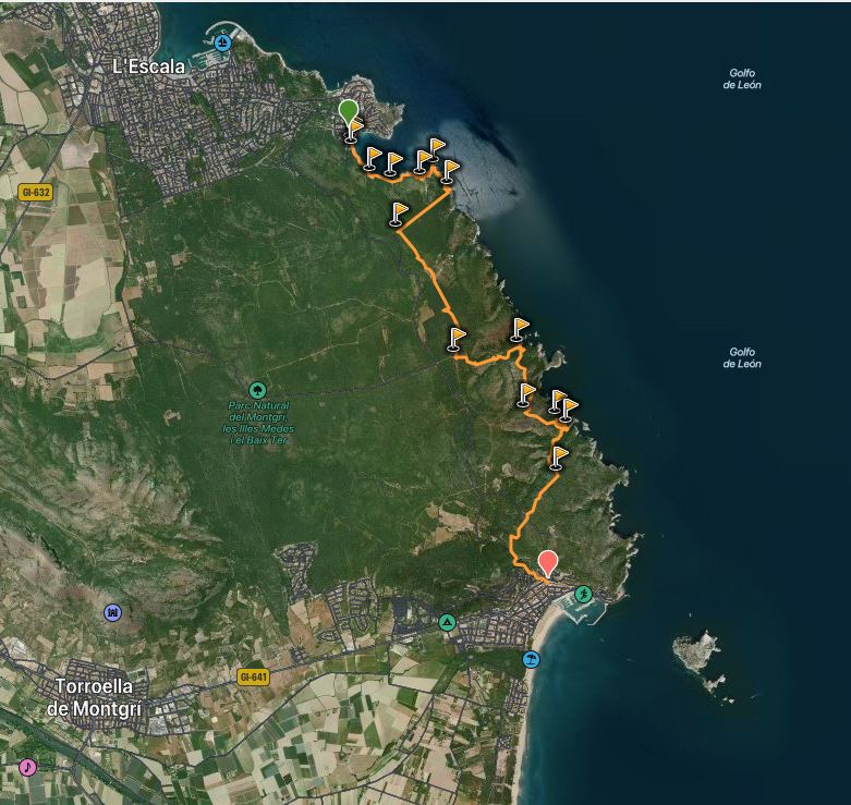El trajecte és de 13.5km, de dificultat moderada degut al terreny pedregós que ens anirem trobant i per les pujades i baixades pronunciades sobretot al tram que transcorre per les cales Ferriol i Pedrosa.
