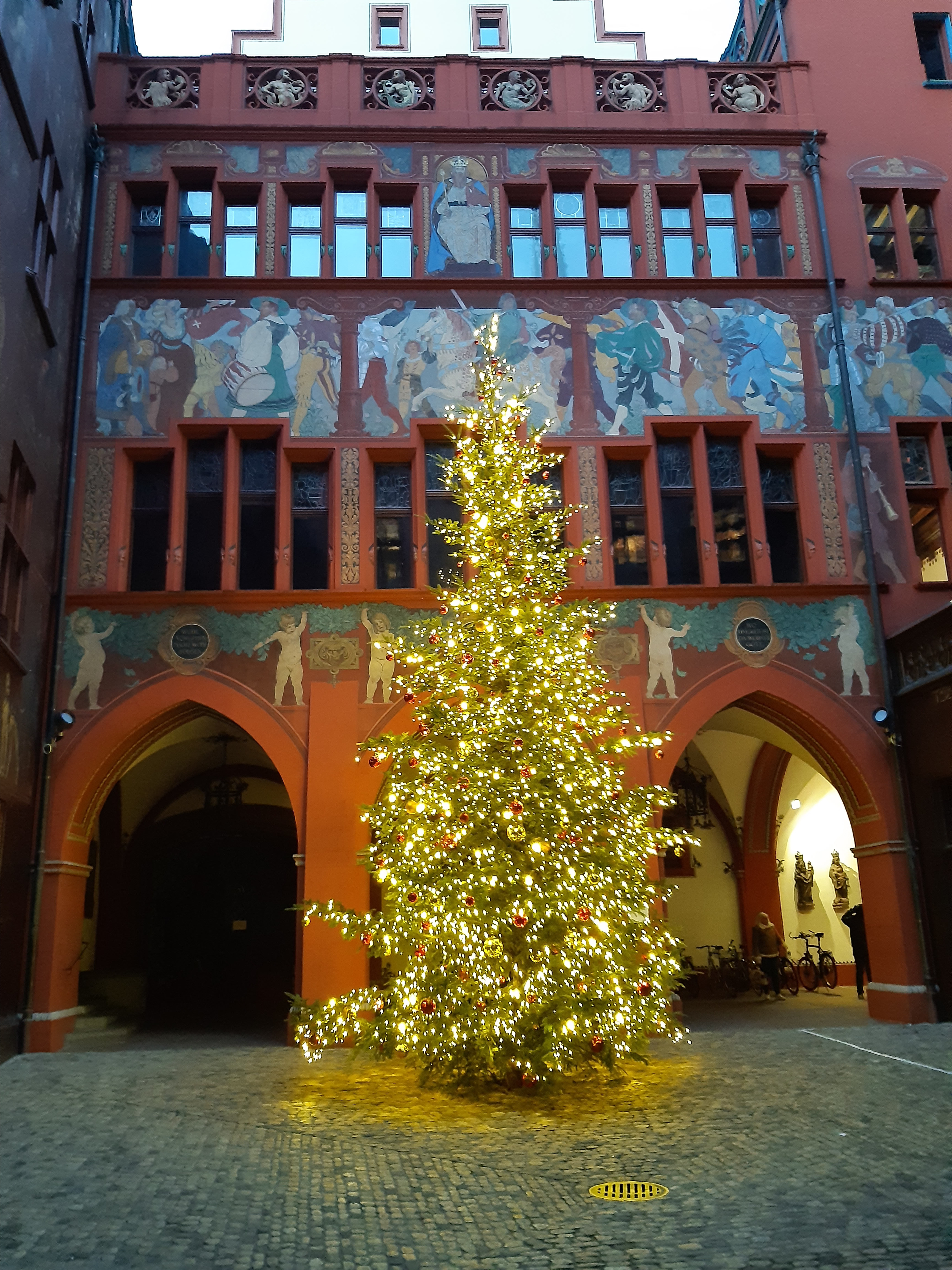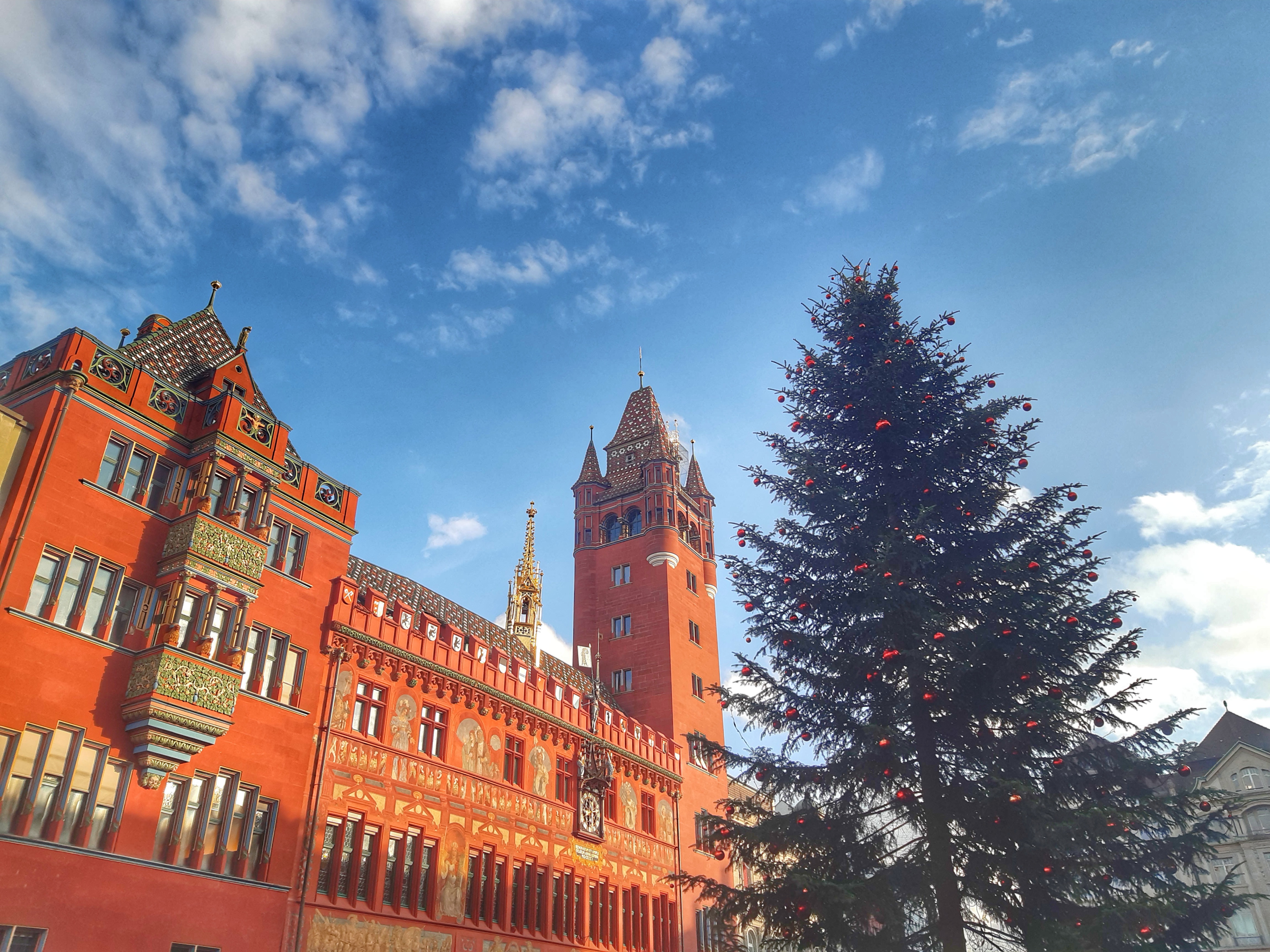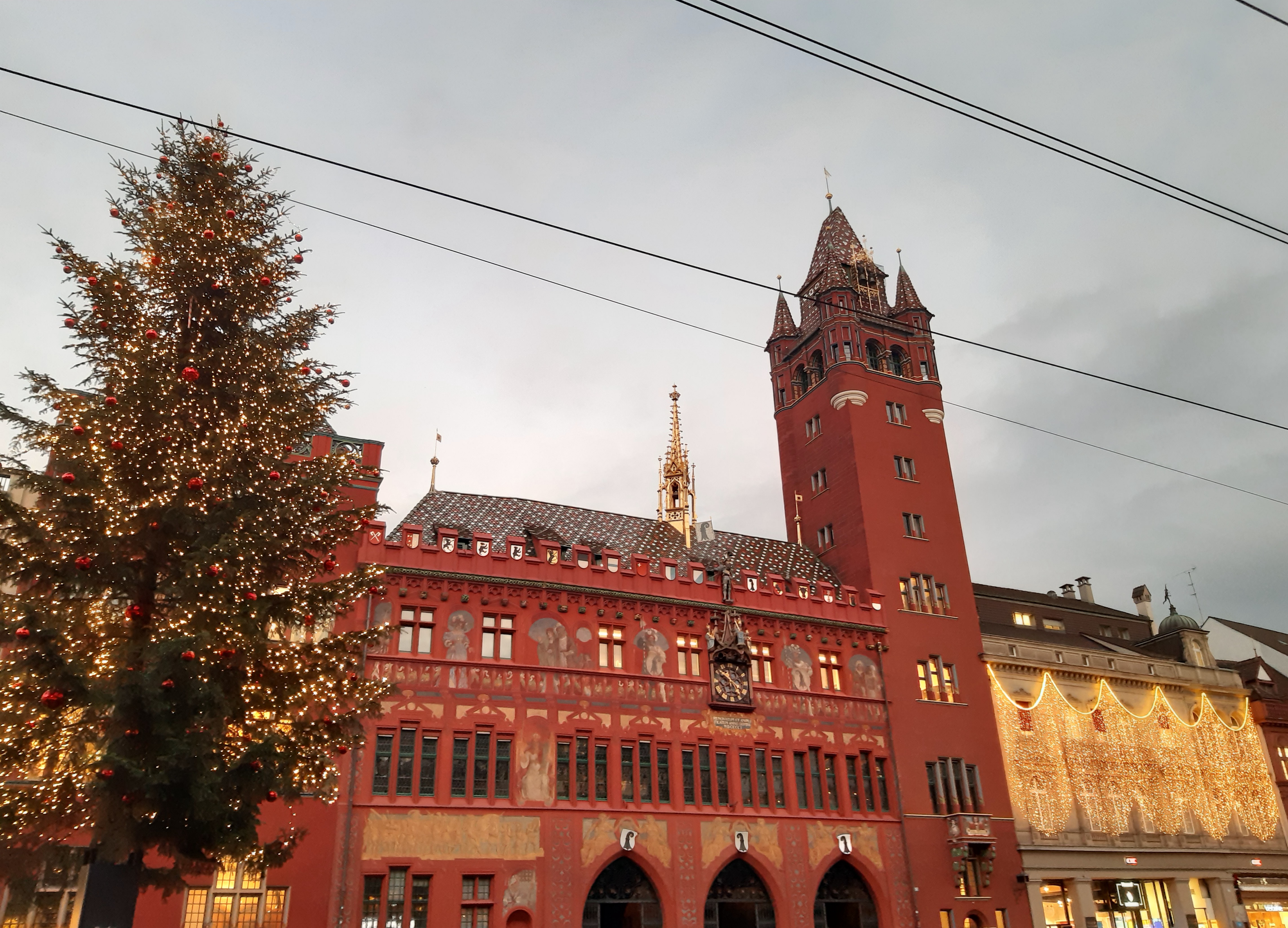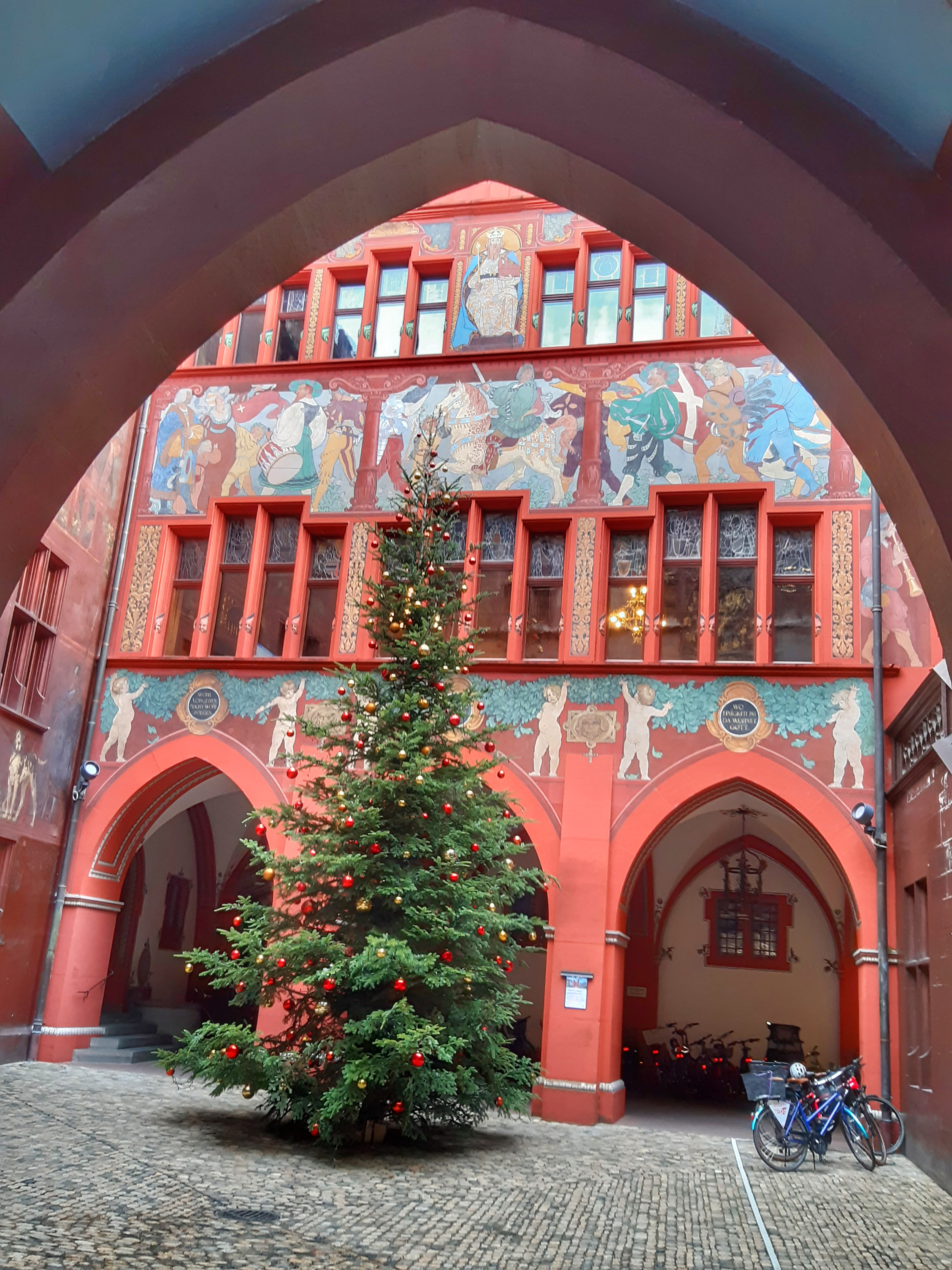 Vam començar la nostra visita a la ciutat per l’animada plaça Markplatz, on els dies feiners al matí s’omple de parades de fruita, verdures i flors 💐. La plaça està rodejada de bonics edificis, on destaca l’icònic Rathaus (l’ajuntament), edifici gòtic del s.XVI amb la inconfusible façana vermella de pedra gres, amb un bonic rellotge i diversos escuts dels diferents cantons de Suïssa. Després de fotografiar-lo 📸 des de tots els angles, vam visitar el deliciós pati interior amb colorides pintures i bonics frescos on ens vam trobar amb un bonic arbre de Nadal i vam poder escriure al “Llibre dels desitjos”.