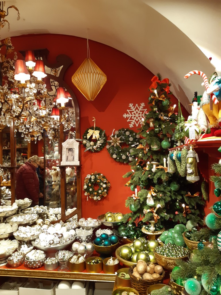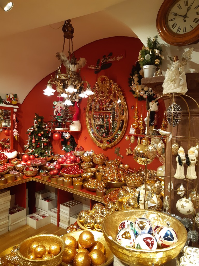 A només 2 minuts caminant ens vam trobar la famosa botiga de nadal de Johann Wanner, considerada la Channel de les festes nadalenques. La Casa Blanca, el Vaticà o el mateix Palau de Buckingham es veu que li encarreguen la seva decoració. Garlandes, llaços i les famoses boles que pengen de l’arbre de Nadal 🎄 elaborades en vidre de Bohèmia bufat a mà amb multitud de formes, omplen la botiga de Nadal més gran del món. Vam trobar boles amb formes tan inverossímils com ara: WC 🚽, vacunes per la COVID 💉, mascaretes… A la façana, sota el nom de la botiga, hi figura una de les paraules més llargues i impronunciables que existeixen en alemany: Weihnachtsbaumschmuckausstattungsspezialgeschaeft que significa literalment botiga especialitzada en objectes de decoració per avets de Nadal.