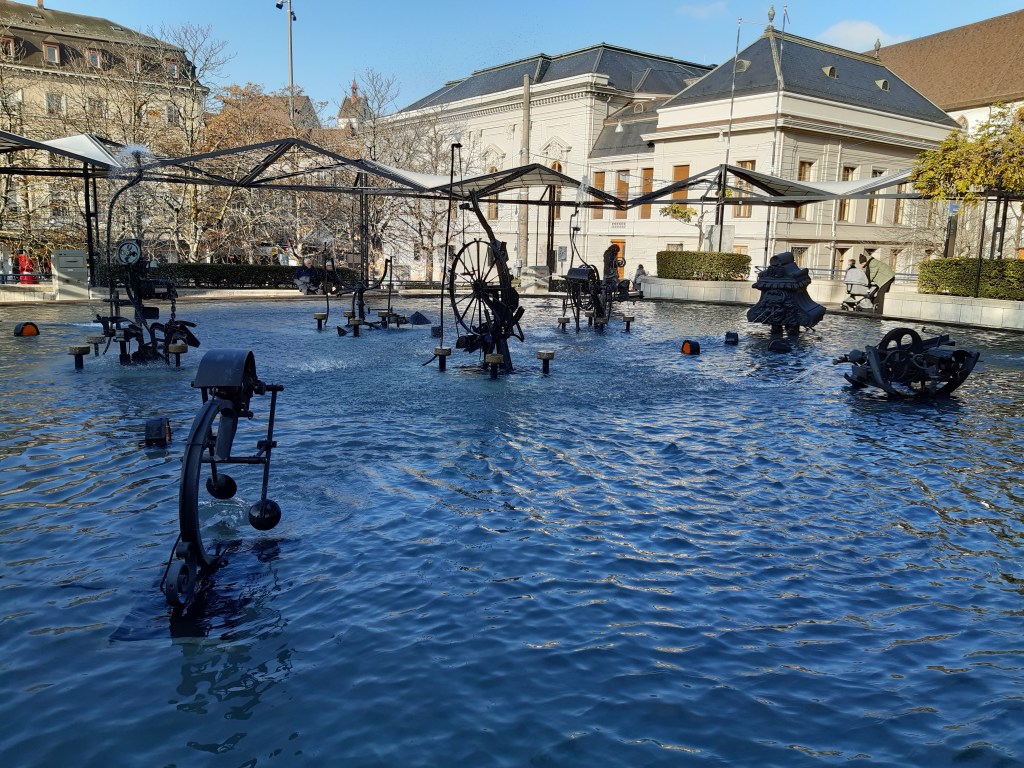 Ja lliures d’equipatge ens vam dirigir cap a la Font de Tinguely ⛲️ una mena de piscina d’aigua amb figures de ferro en moviment. Aquesta font, obra de l’artista suïssa Jean Tinguely es va construir el 1977, al lloc on hi havia l’escenari de l’antic teatre de Basilea. Per mantenir l’esperit del teatre, l’autora va dissenyar un sistema que, gràcies a la força dels raigs d’aigua, les nou figures de l’estany continuaven ballant com ho feien els actors en el passat.