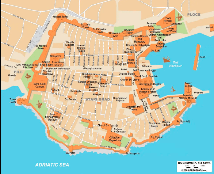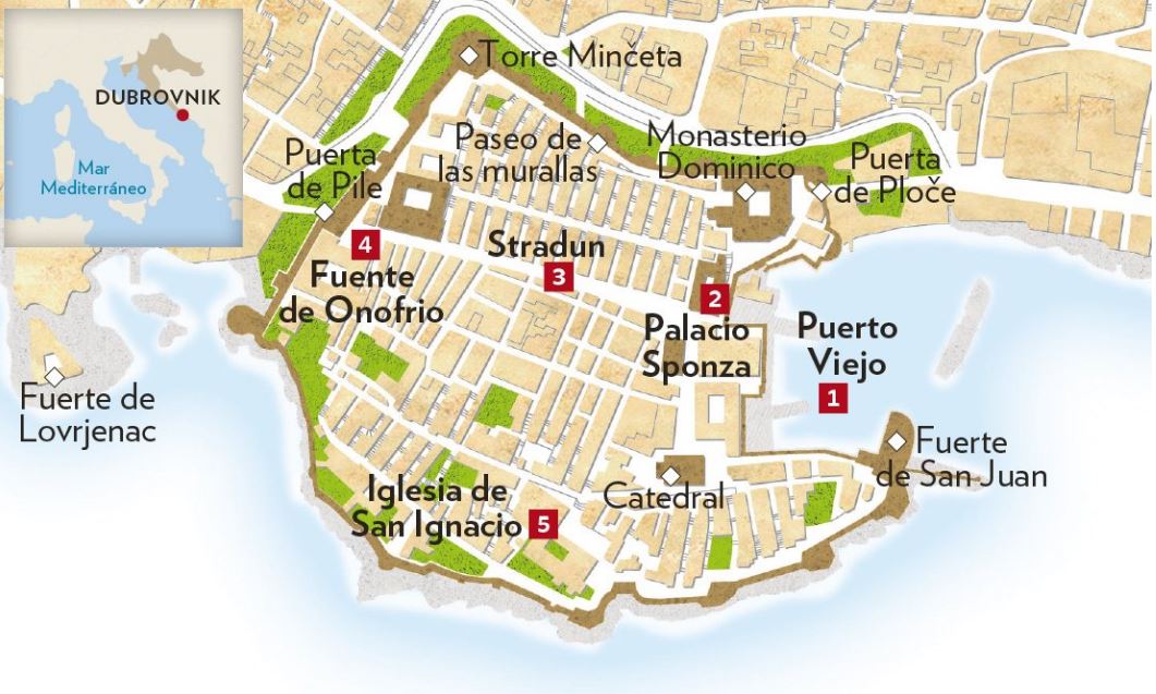 Al final del carrer s’arriba a la Plaça de la Luza, una de les places més boniques de Dubrovnik. S’hi troben diversos llocs turístics destacables, com la Torre del Campanar, el Palau de Sponza, antic centre de duanes i un dels principals edificis econòmics de l’antiga República de Ragusa, l’estàtua del paladí Orlando, heroi que va defensar la ciutat en un atac turc segons diu la llegenda, erigit com a símbol de la ciutat i la petita Església de Sant Blai. La catedral de Dubrovnik, anomenada la Catedral de l’Assumpció de la Verge Maria , és un dels imprescindibles a veure a Dubrovnik.