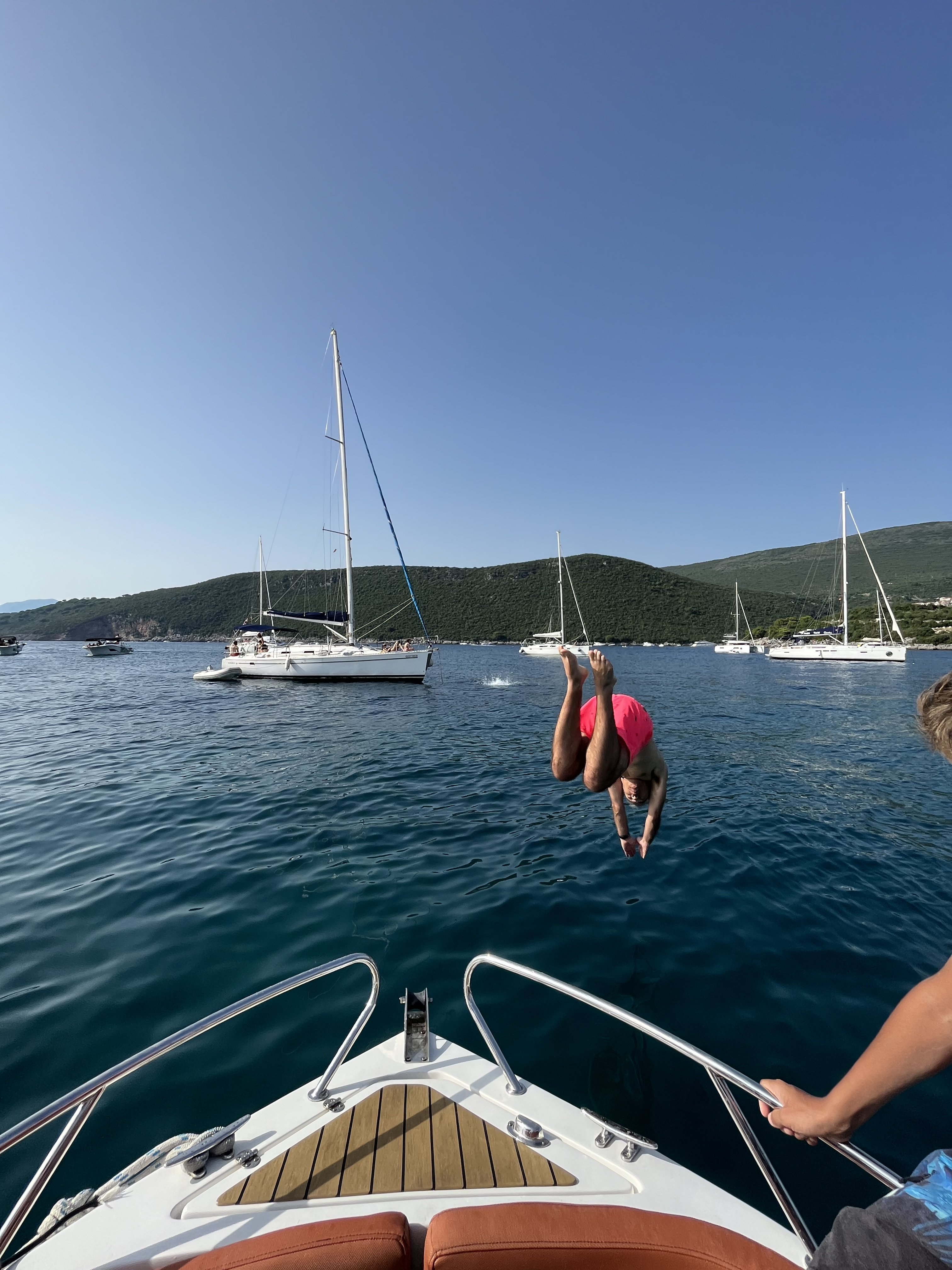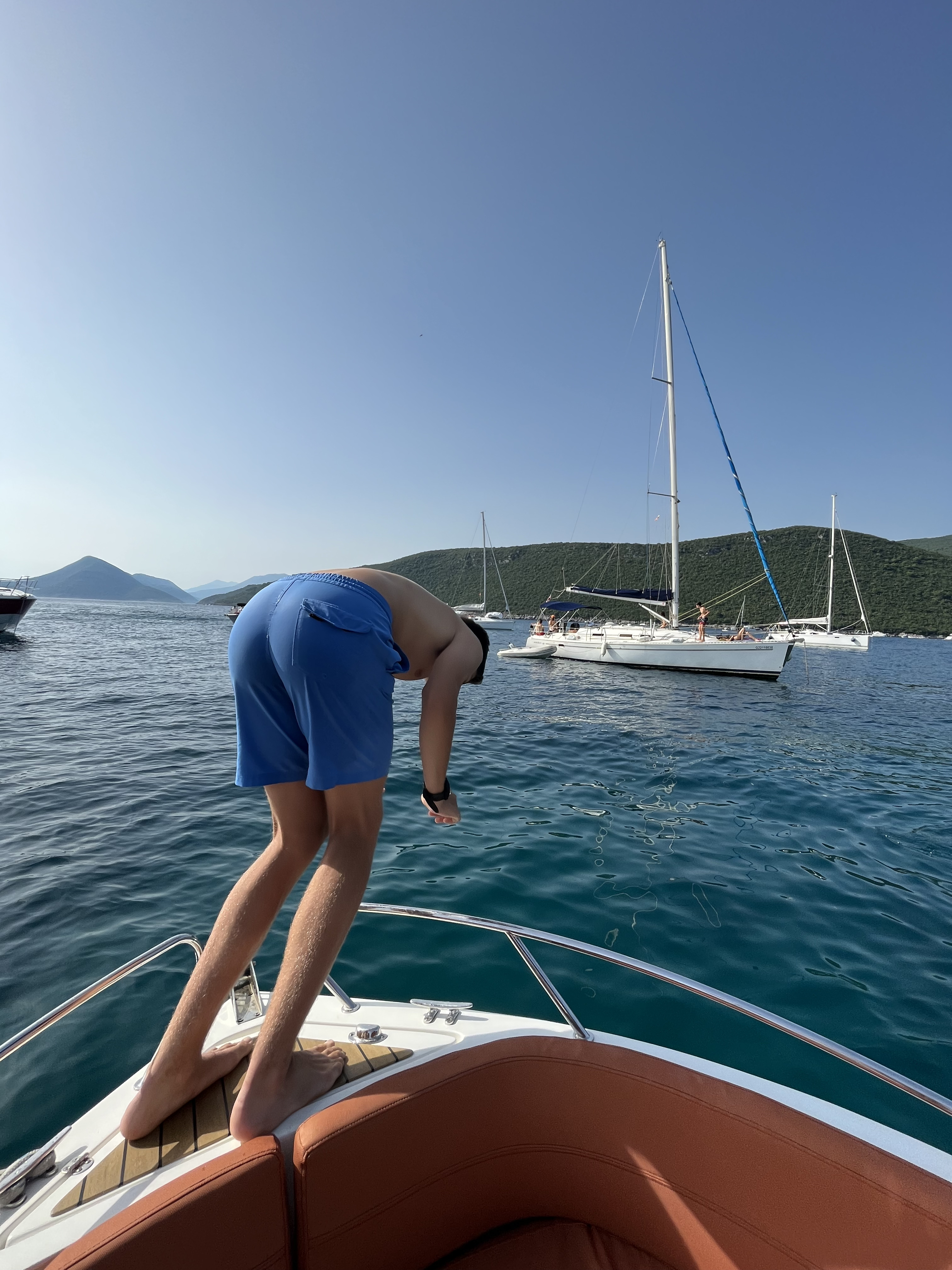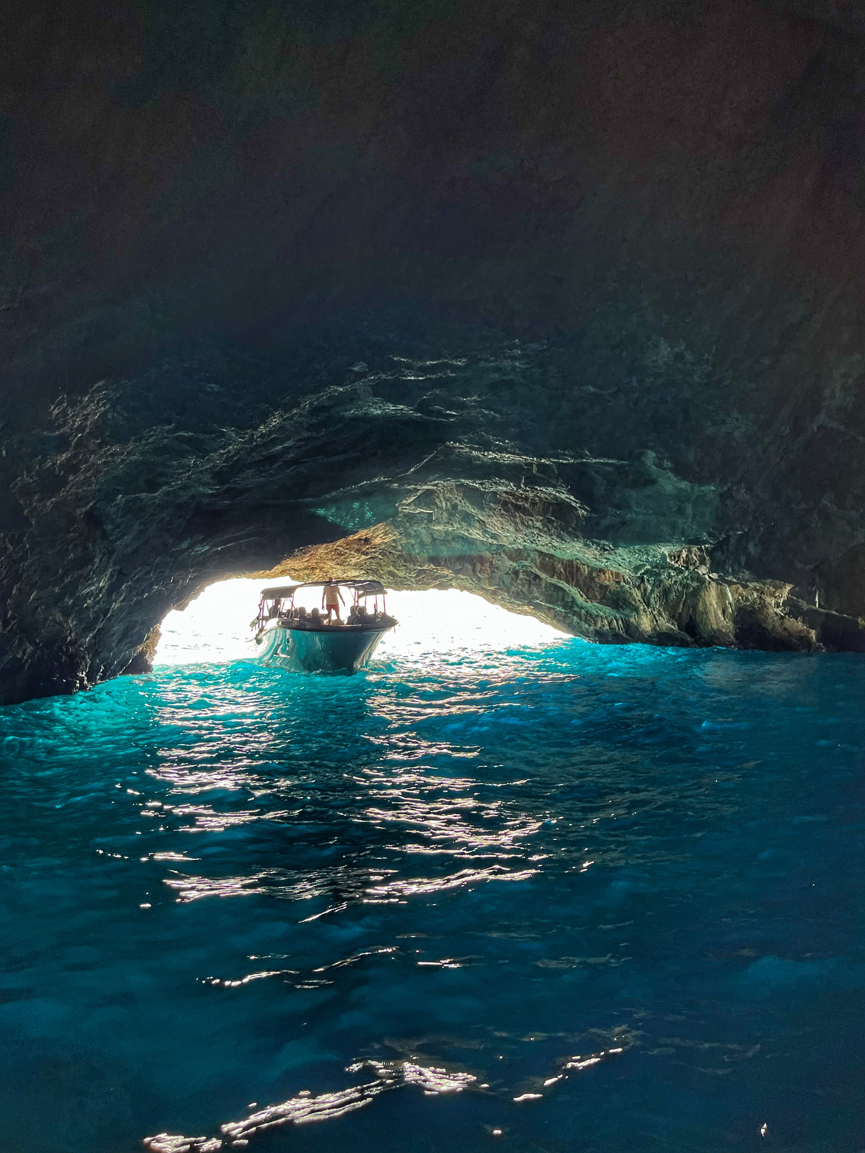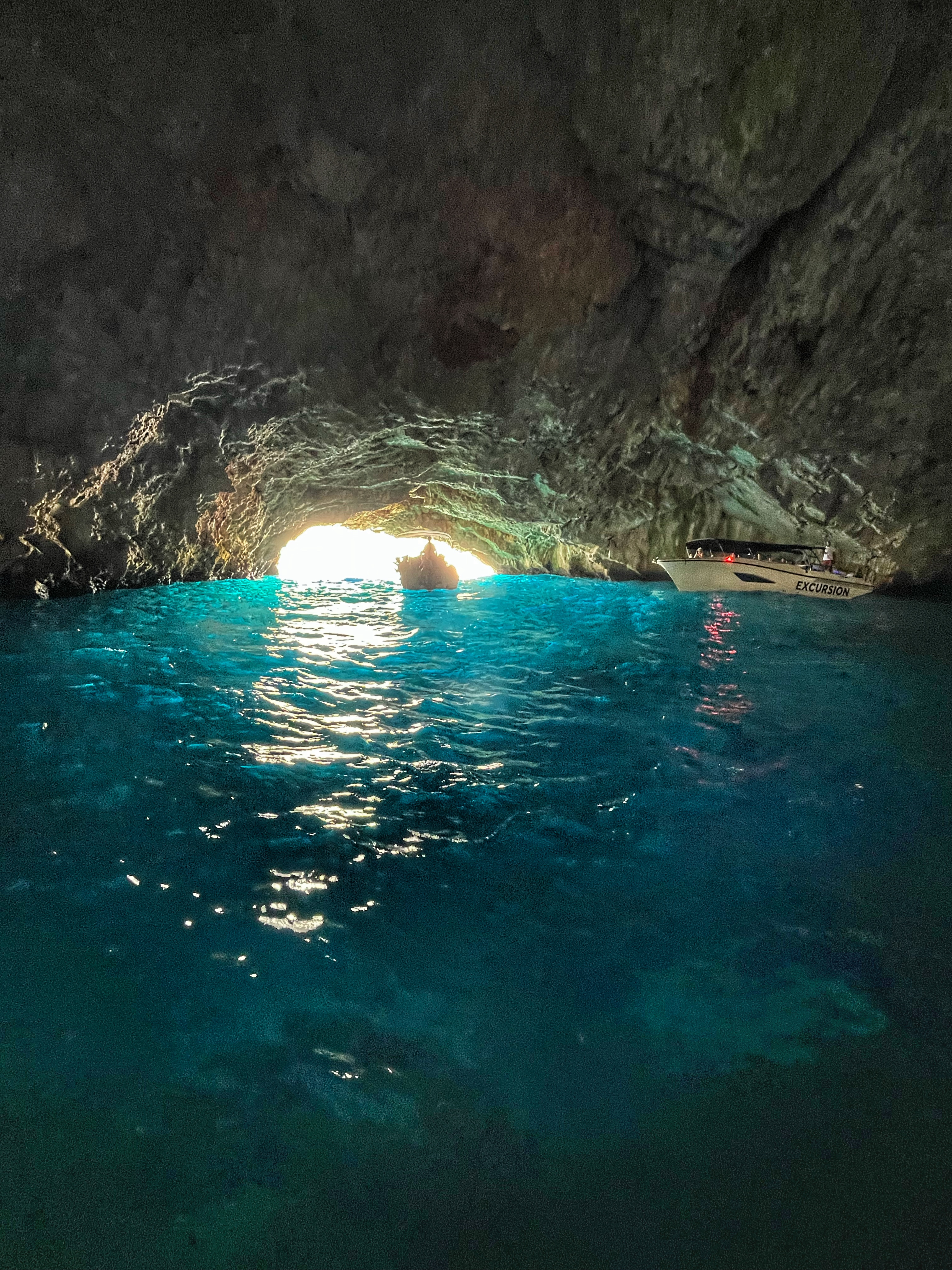 Per la tarda ens vam apropar fins al port on ens esperava la nostra llanxa 🚤 que ens portaria fins a la Blue Cave, es tracta d’una cova impressionant ubicada a la península de Lustica i és un dels principals atractius turístics de Montenegro. Es diu la Cova Blava perquè la manera com la llum arriba al fons de sorra i es reflecteix a través de l’aigua fa que tota la cova sembli blava.