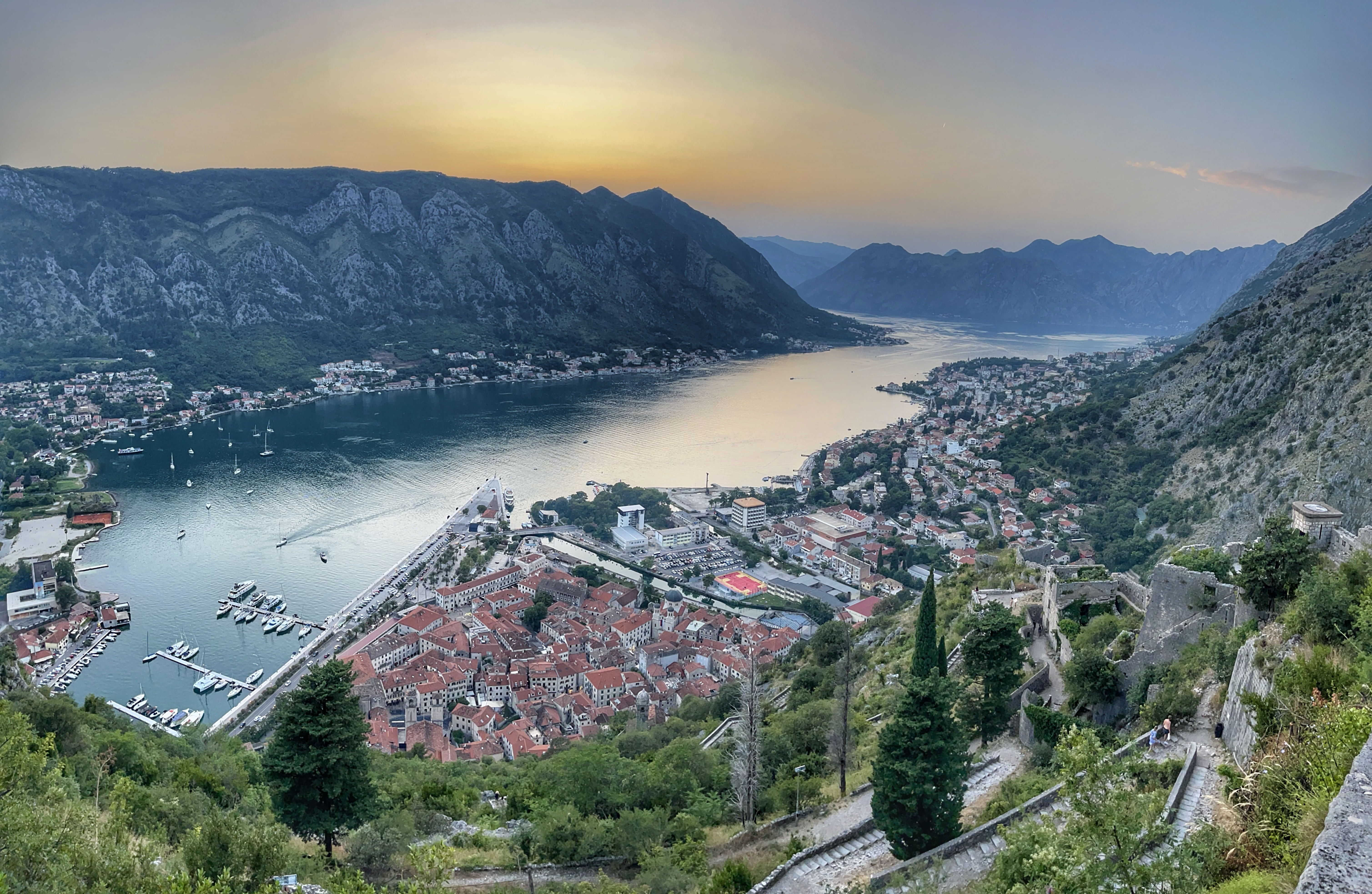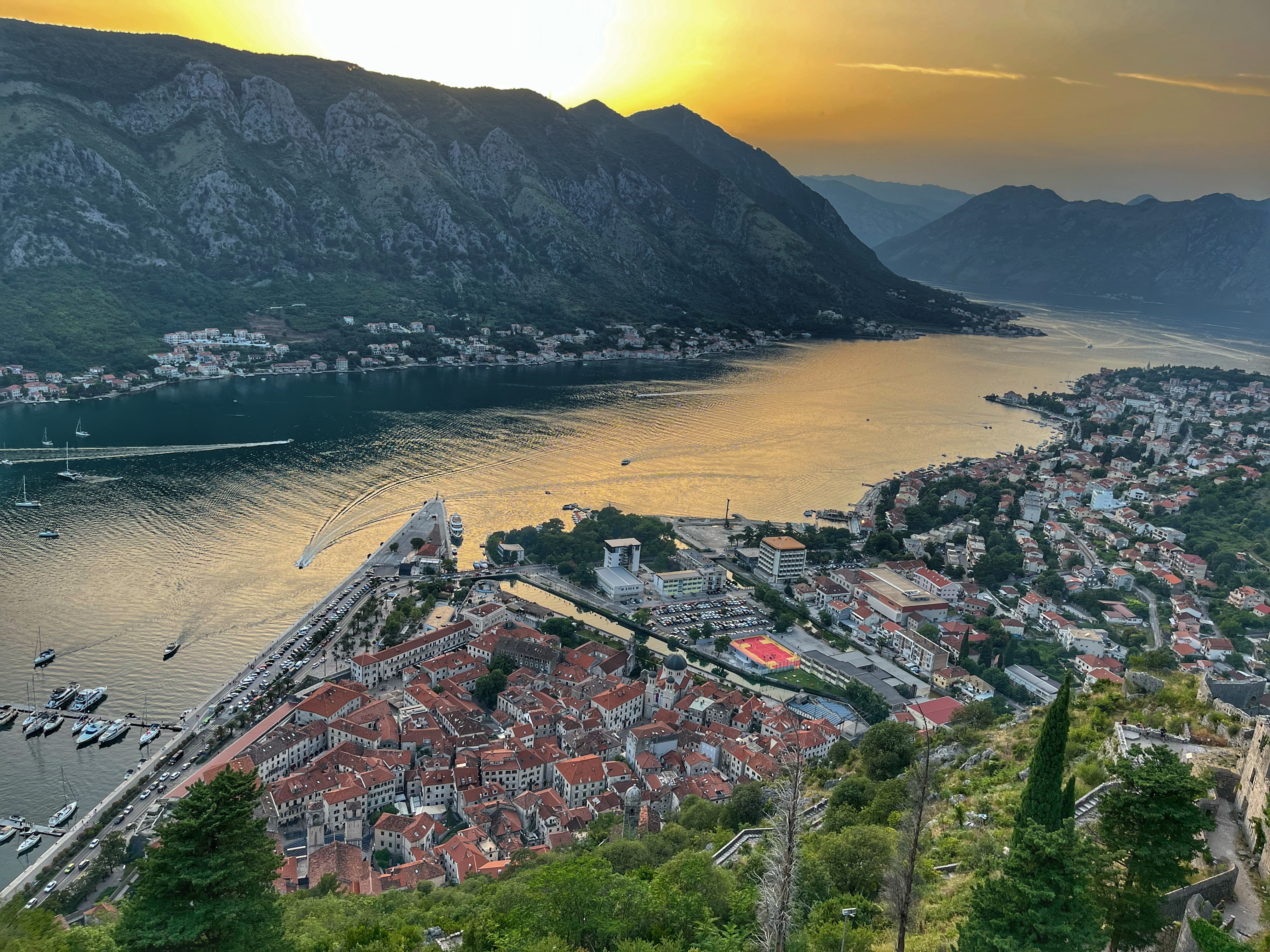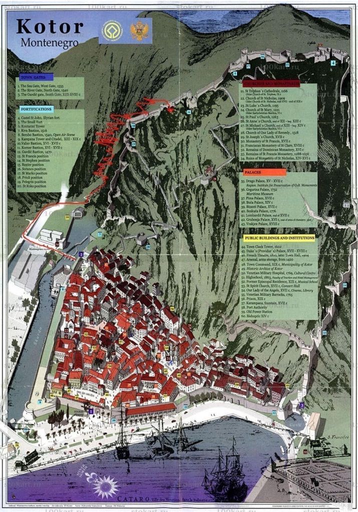 No és d’estranyar que les llegendes locals diguin que Kotor es va construir amb l’ajuda d’una fada. La ciutat compacta i en forma de triangle està flanquejada pels dos costats per aigua de safir i recolzada per una imponent muntanya de color verd maragda. Muntanya amunt, les parets de pedra van fent ziga-zaga fins a les ruïnes enfonsades del castell de Sant Giovanni. Només arribar a Kotor és impossible eludir la vista a les seves muralles, bé perquè se’ns presentin davant, a la nostra altura, i amb tres portes, una al centre i dues als extrems (una donant al riu Skurda i l’altra al seu dia oberta al mar); o bé perquè com un jardí penjoll van seguint l’orografia de la muntanya Lovcen (Parc Nacional i Reserva Natural) fins a tancar-se uns quants centenars de metres sobre nosaltres.