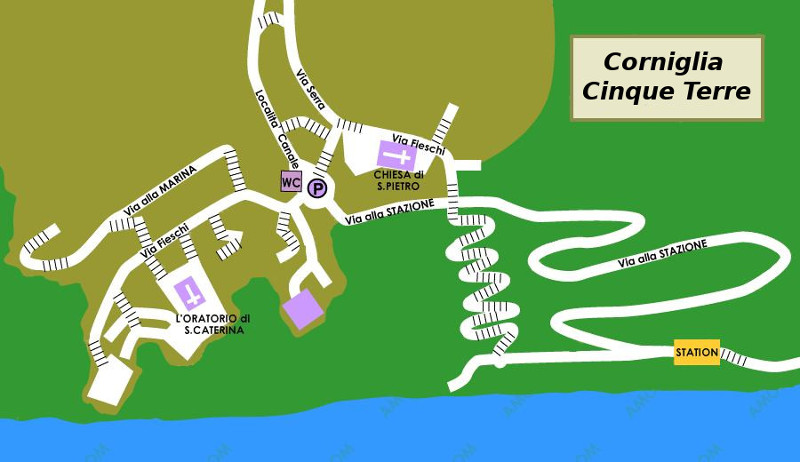 Es creua la carretera asfaltada i s’arriba a les cases altes del poble de Corniglia i a l’església de Sant Pietro ja documentada l’any 1267.