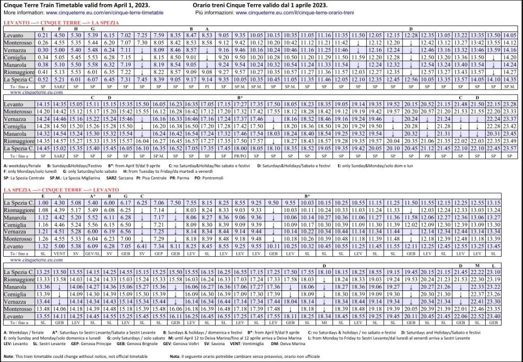 Passen cada 25-30 minuts i teniu trens fins a les 23:30h. Els bitllets senzills costen 5€, així que és molt recomanable comprar la Tarjeta Cinque Terre.