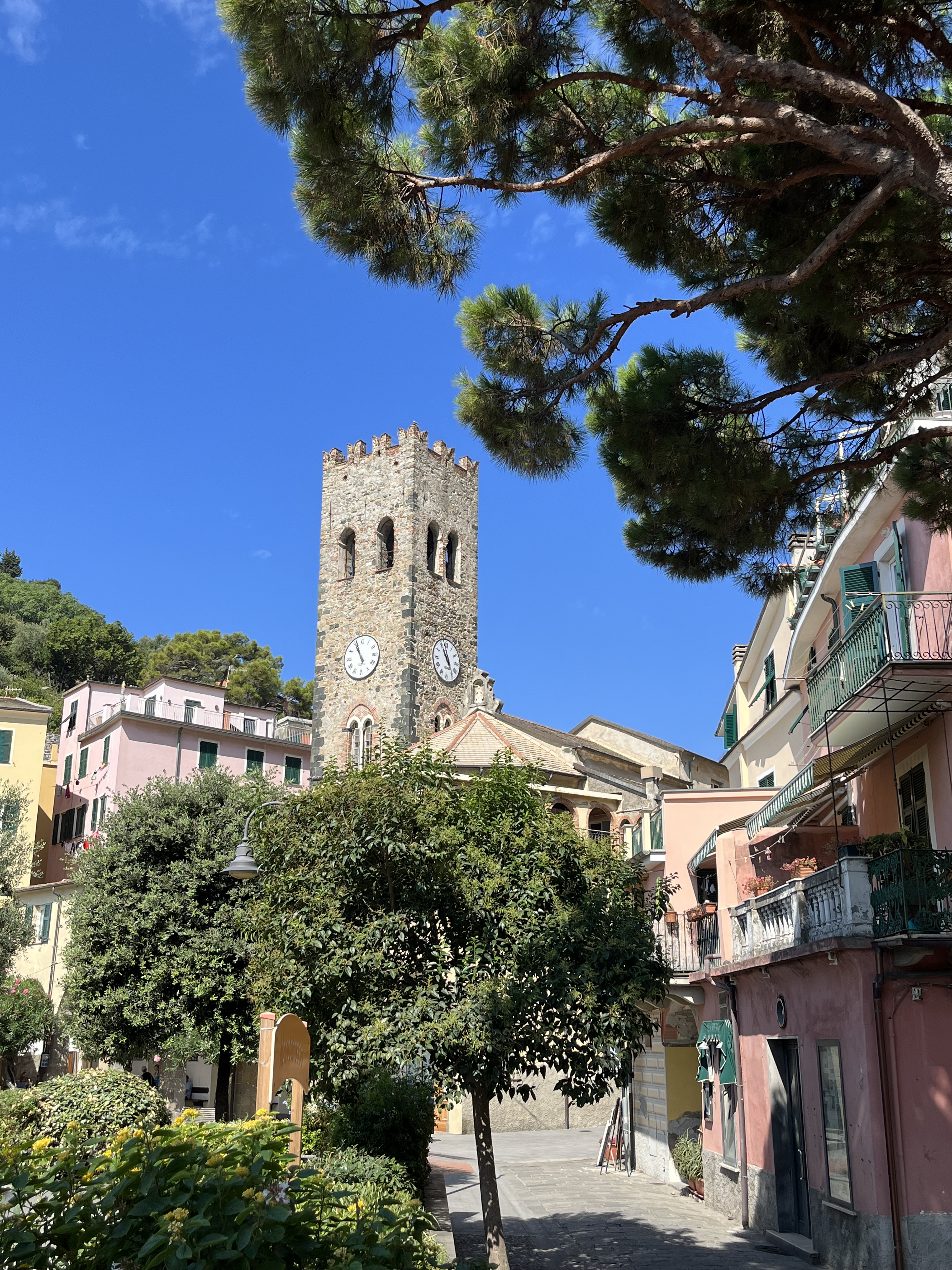 El fet de que Corniglia no tingui accés en vaixell, fa que arribin menys turistes, cosa que vam agraïr moltíssim 👏🏼👏🏼. Aconseguireu una bona panoràmica des del mirador de la Torre situat just a sobre de la plaça principal de Corniglia ( Piazza Taragio ), amb vistes de Manarola.