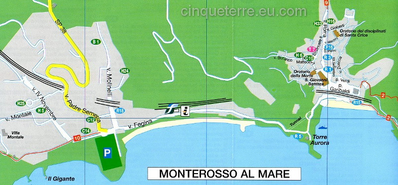 Monterosso al Mare és el poble més gran de les Cinque Terre . El poble es divideix en dos sectors : d’una banda trobem la zona de la Fegina (la part moderna) i de l’altra el port vell (el centre històric) comunicats travessant un túnel excavat a la roca.