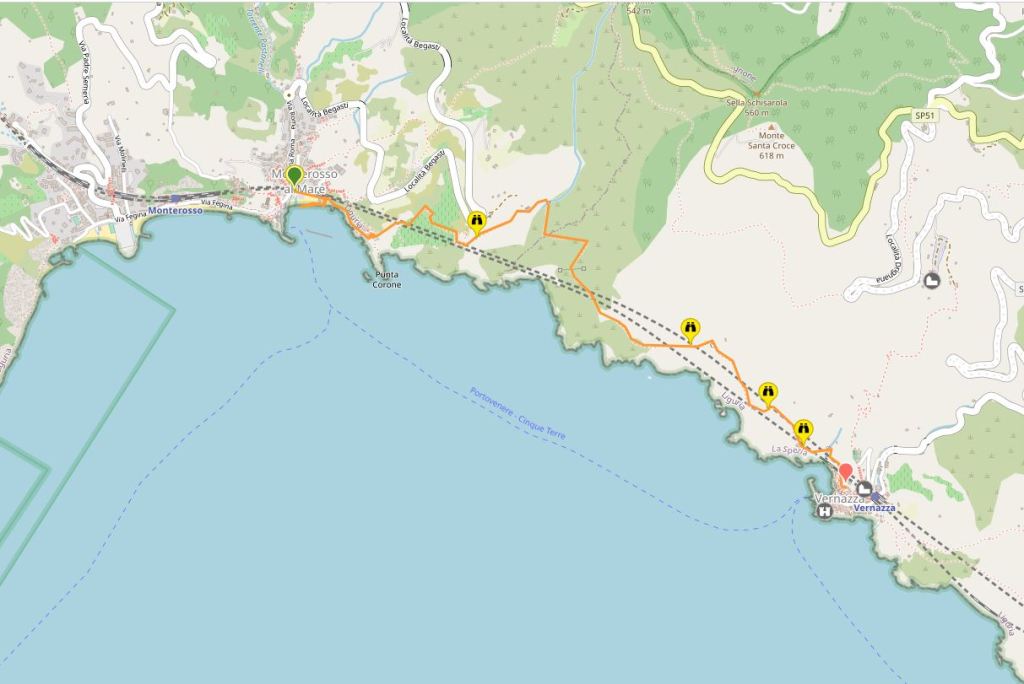 Aquest trekking de 4,1km (2hores) està inclós a la Cinque Terre Card Trekking i és un tram del sentiero azzurro (marques vermelles i blanques).
