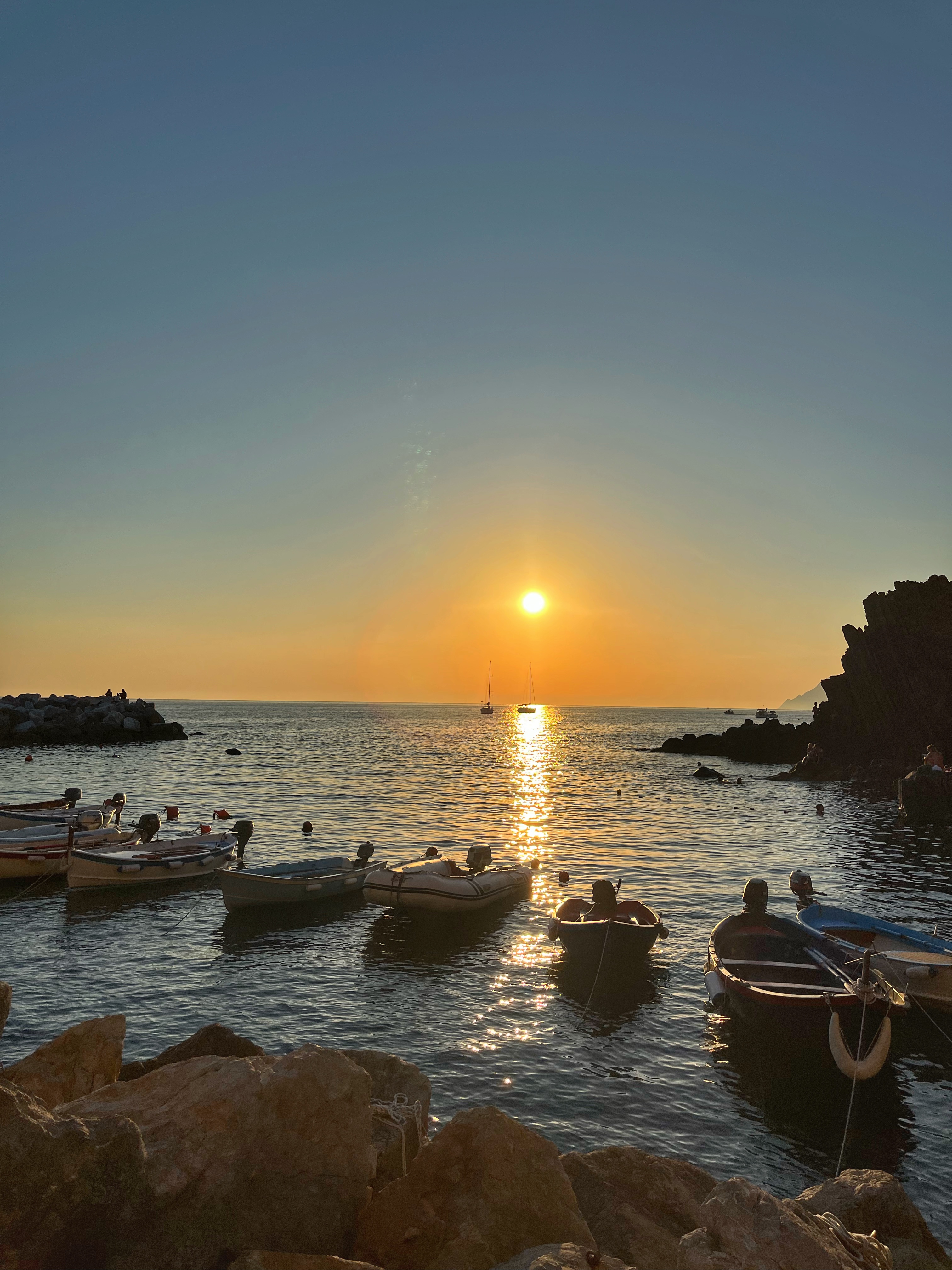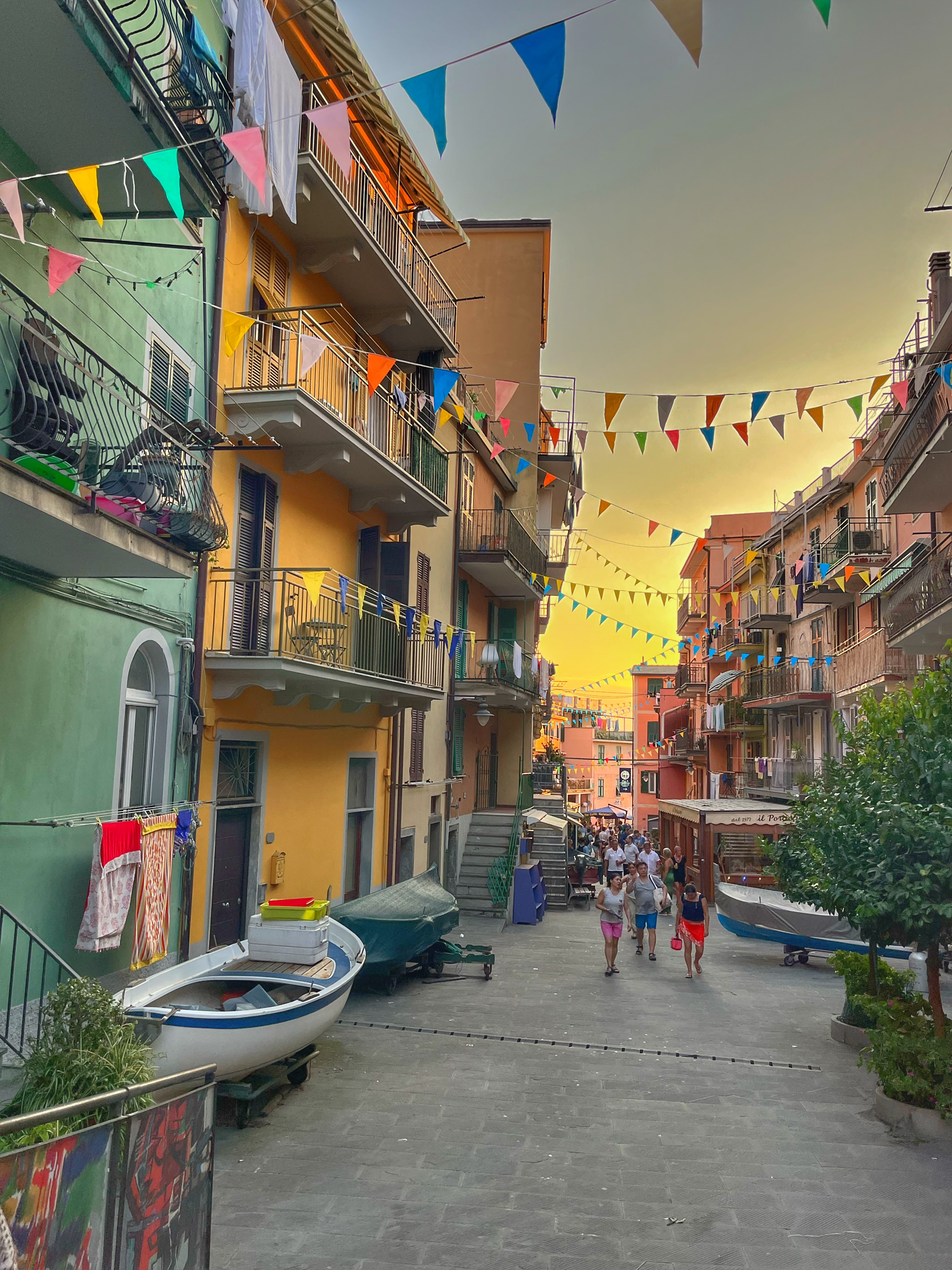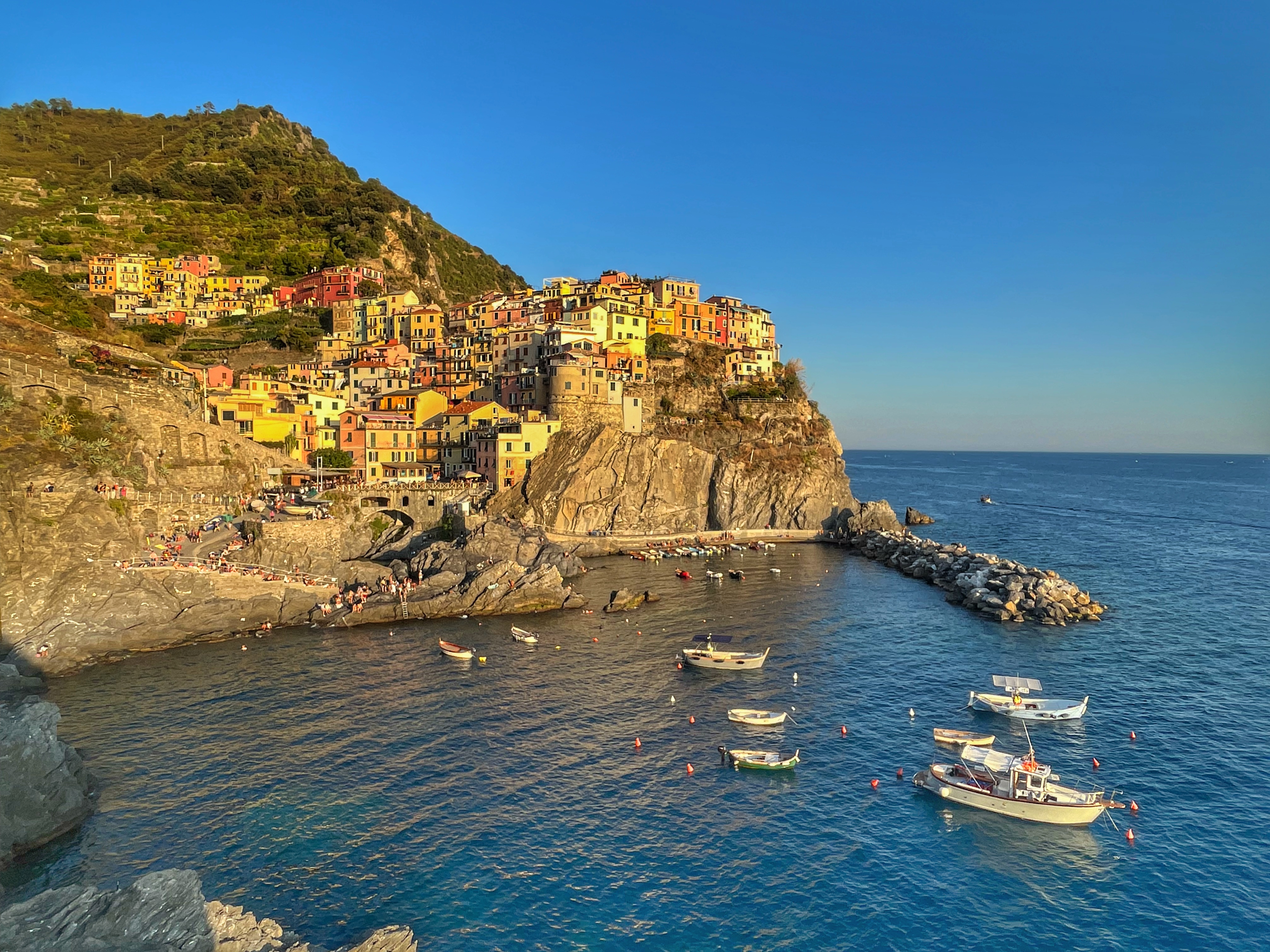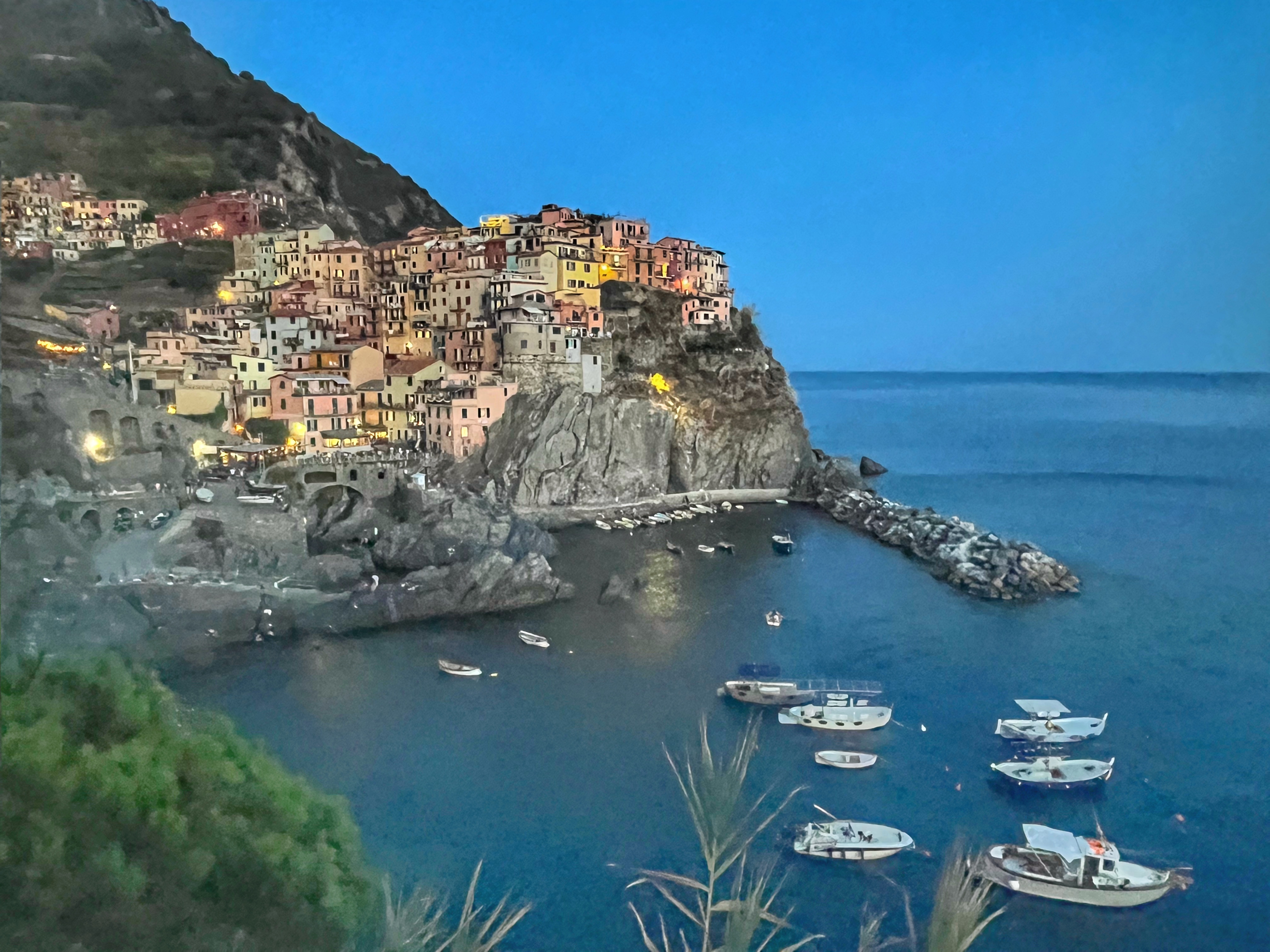 Manarola , construït sobre un penya-segat de roca a 70 metres sobre el nivell del mar, és un dels pobles més encantadors i romàntics de les Cinque Terre. Destaquen el petit port que compta amb una rampa per a barquetes 🛶 de rems de colors, l’entremat de carrerons estrets i costeruts i les pintoresques cases de colors davant del mar.