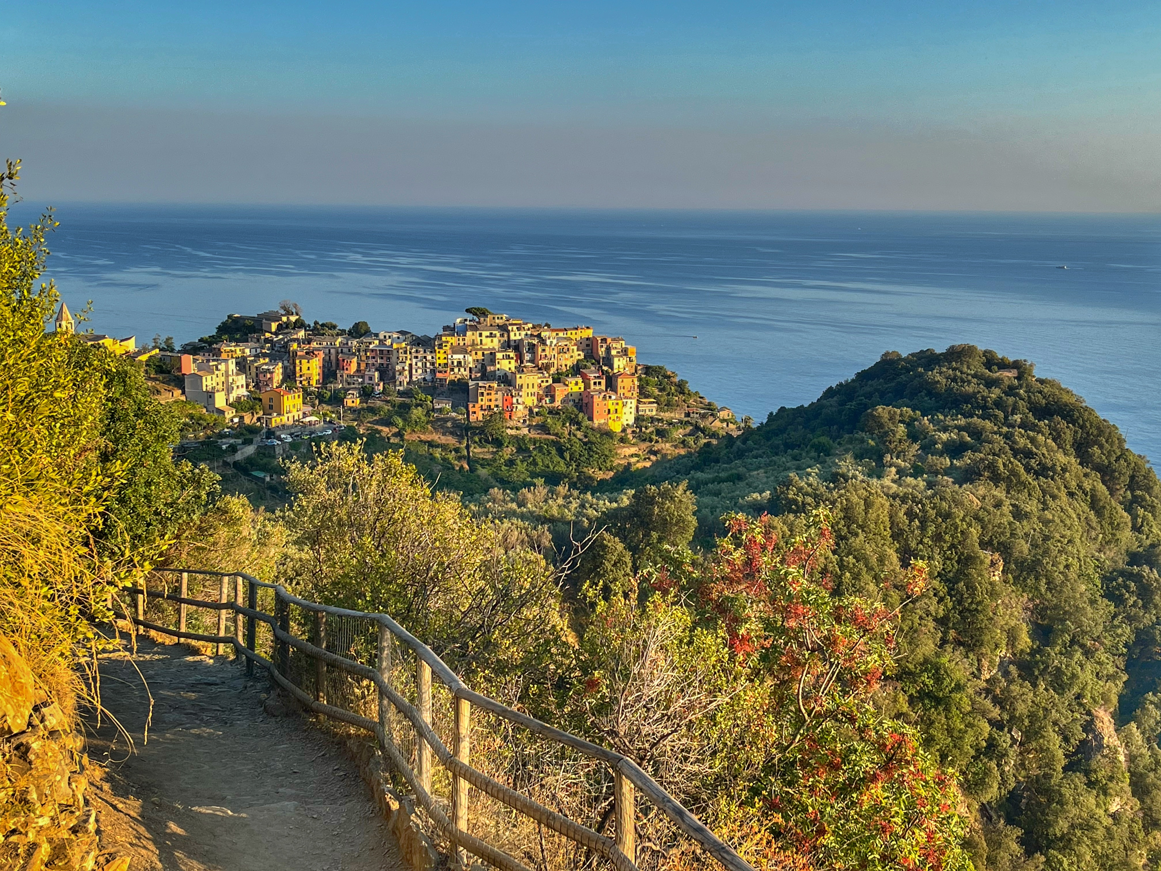 El sender, la major part protegit per una barana de fusta, recorre la costa amb unes magnífiques vistes dels penya-segats. Aviat es comença a albirar Corniglia, l’únic poble de les Cinque Terre que es troba elevat en un promontori a 100m d’alçada i no te contacte amb el mar.