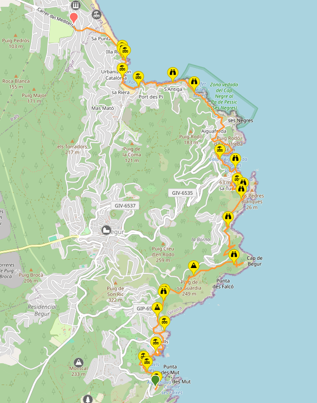 Hem gaudit d’una travessa molt variada on tant anàvem a tocar de costa, com ens enfilàvem uns quants metres, com la pujada al puig de Sa Guàrdia amb rampes força pronunciades 🥵. Durant el camí ens hem deleïtat amb algunes de les cales més boniques del litoral català, com la platja d’Aiguablava, la de Sa Tuna o la de l’illa Roja. En total han estat quasibé 13km amb un desnivell acumulat d’uns 650m que hem fet en unes 5 horetes, amb totes les parades de rigor per descansar i fer mooltes fotos 📸 !! Durant el recorregut hem seguit primer les senyals del GR (blanques i vermelles) i després les senyals del sender local/camí de ronda (blanques i verdes). En algun tram trobarem a faltar la senyalització.