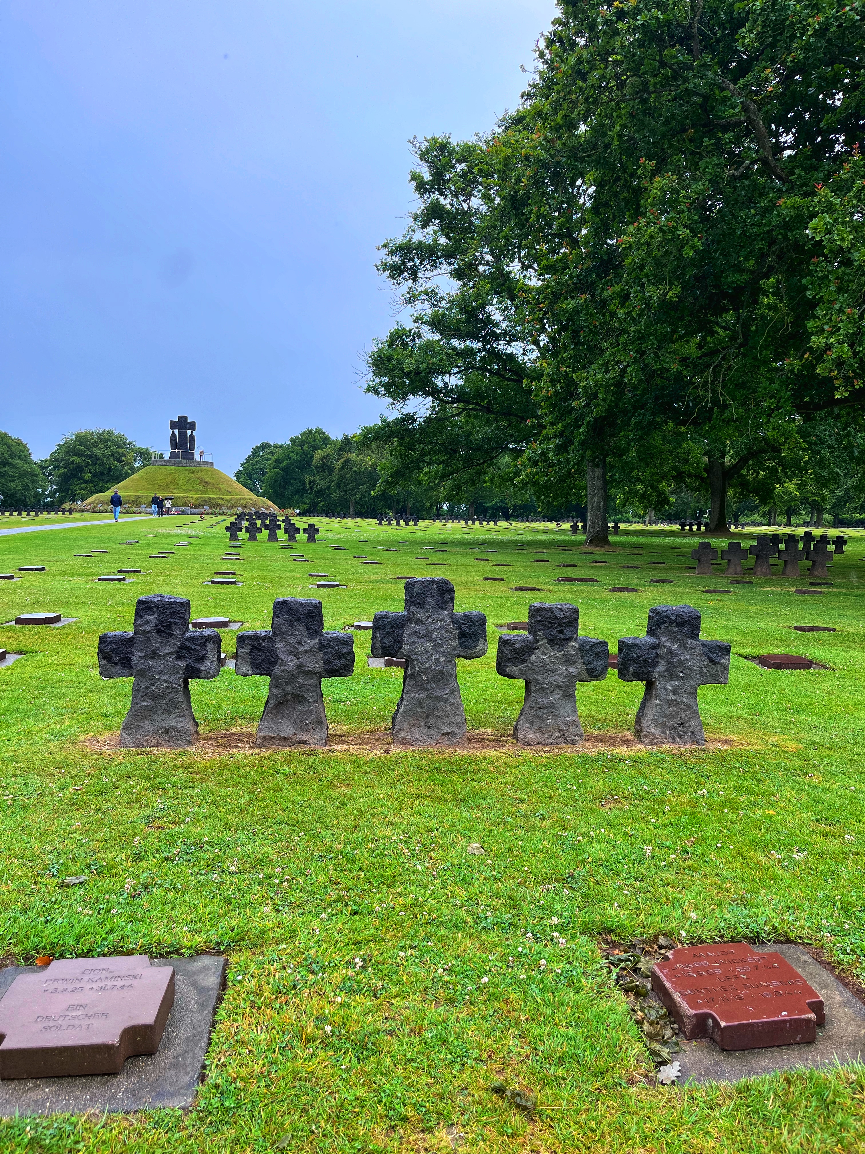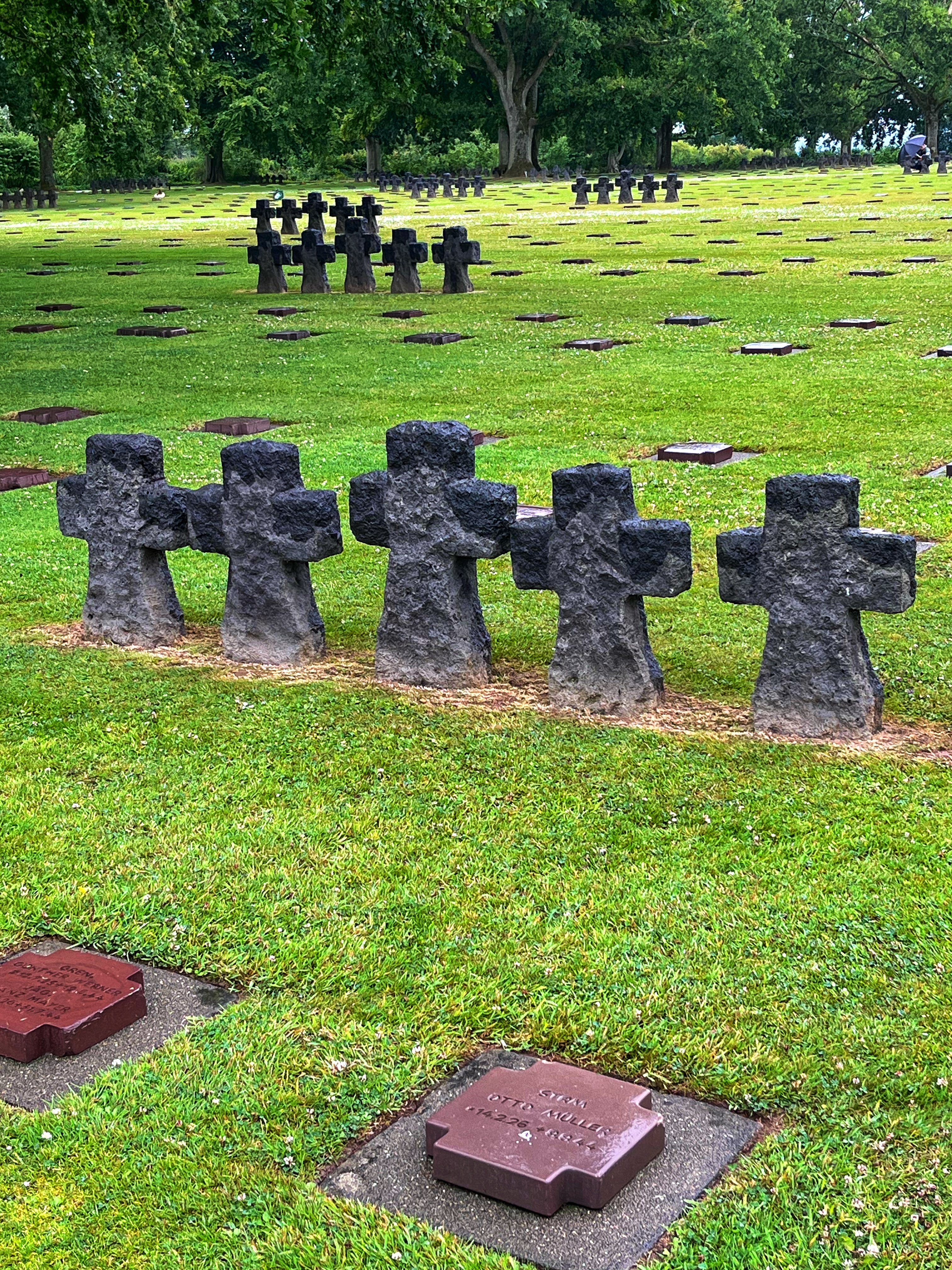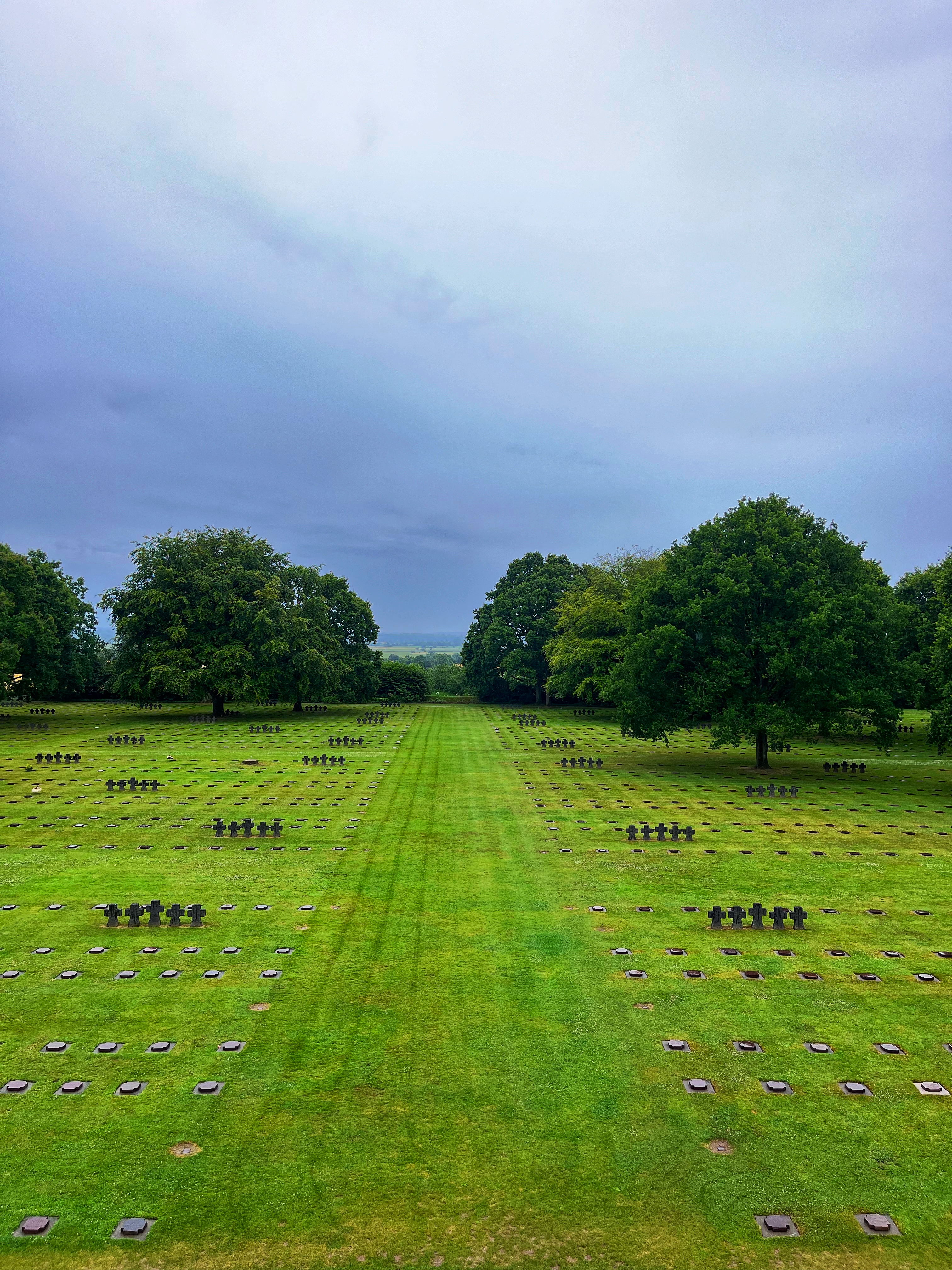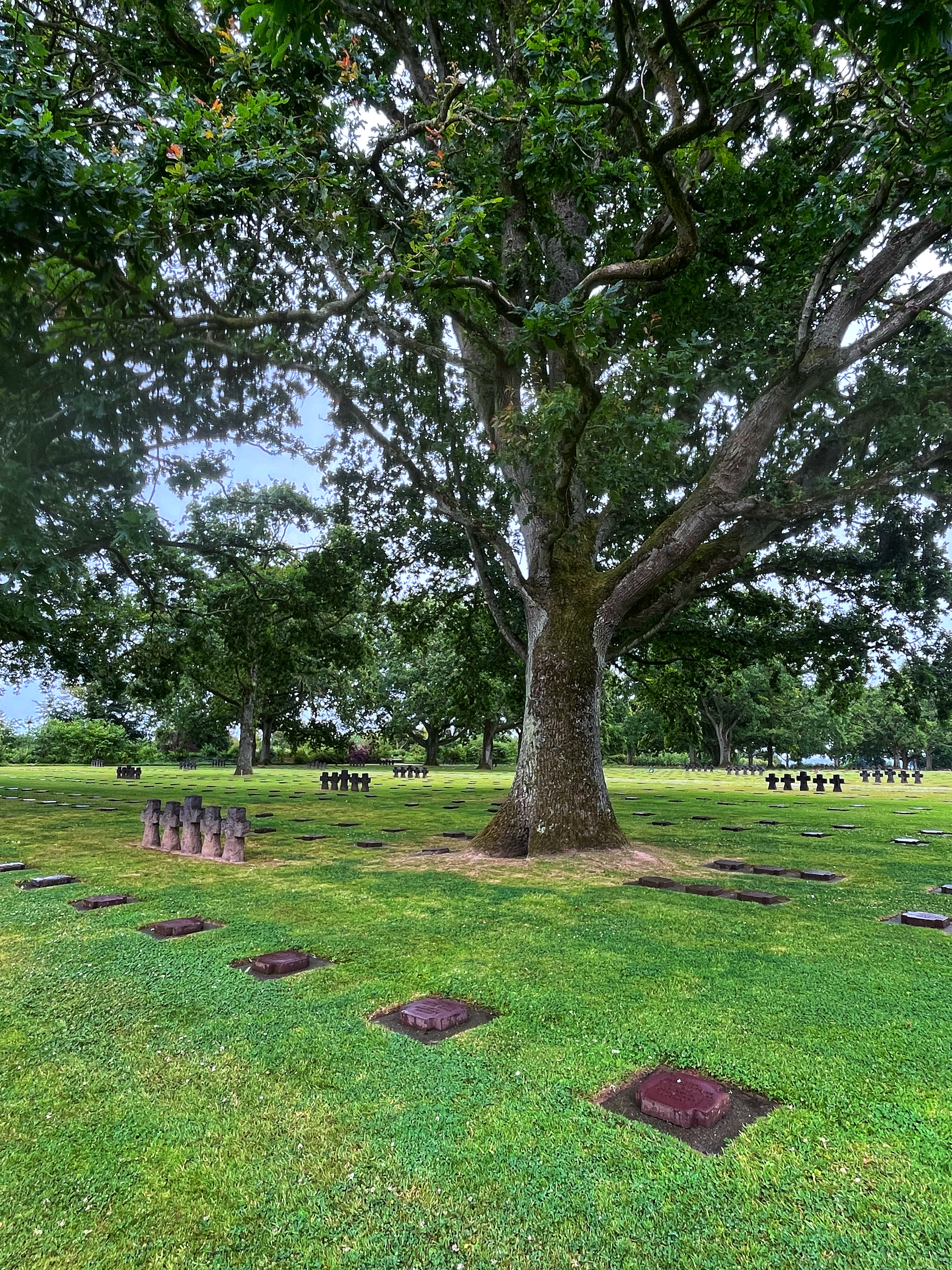 Després de la visita i amb el matí plujós 🌧️ ens vam desplaçar fins al cementiri 🪦alemany 🇩🇪 de la Cambe, inaugurat al setembre de 1961. Val la pena veure l’altra costat de la guerra, la dels perdedors. A les seves 7 hectàrees de superfície hi ha enterrats 21.222 soldats alemanys caiguts en combat a Normandia, la majoria entre el 6 de juny i el 30 d’agost de 1944. Fa fredat veure la joventut dels soldats enterrats 😭. L’accés al cementiri és lliure.
