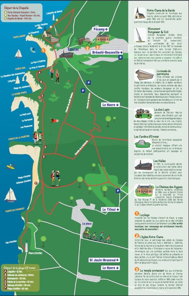 Vam aparcar a l’àrea d’AC just al principi del poble. Es tracta d’una àrea petita però molt ben situada per descobrir Etretat i així poder gaudir dels seus impressionants penya-segats, on destaquen la «Falaise d´Aval» i <<l’Aiguille>> i la «Falaise d´Amont», al cim del qual se situa la petita i coqueta Església Notre-Dame de la Garde i els jardins d’Etretat.