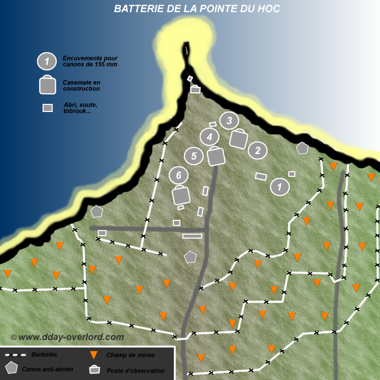 Pointe du Hoc és conegut per l’atrevit i quasi suicida assalt dut a terme el 6 de juny de 1944 pel 2n Batalló de Rangers dels Estats Units (225 homes dels quals només en quedarien 90) en un esforç per neutralitzar la bateria d’artilleria alemanya. El matí del dia D després d’una ascensió perillosa amb escales de corda i ganxos, els comandos nord-americans es van enfrontar amb artillers alemanys en una sagnant batalla. Un cop victoriosos, els Rangers es van sorprendre de trobar els búnquers buits i les armes desaparegudes. Semblava que els alemanys els havien traslladat recentment. Després d’una breu recerca, els Rangers els van trobar amagats en una carretera enfonsada propera…