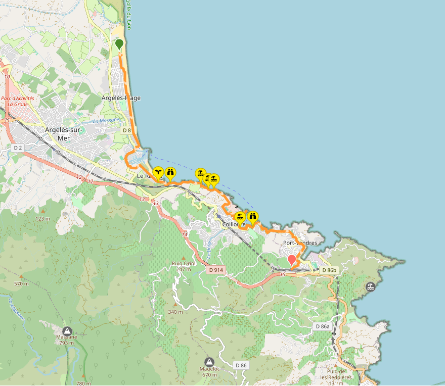 Nosaltres com que estàvem allotjats al Càmping le Roussillonnais d’Argelès-sur-mer vam començar la ruta des d’allà mateix, fent una parada a la bucòlica localitat de Cotlliure i fent la tornada en tren des de Port-Vendres.