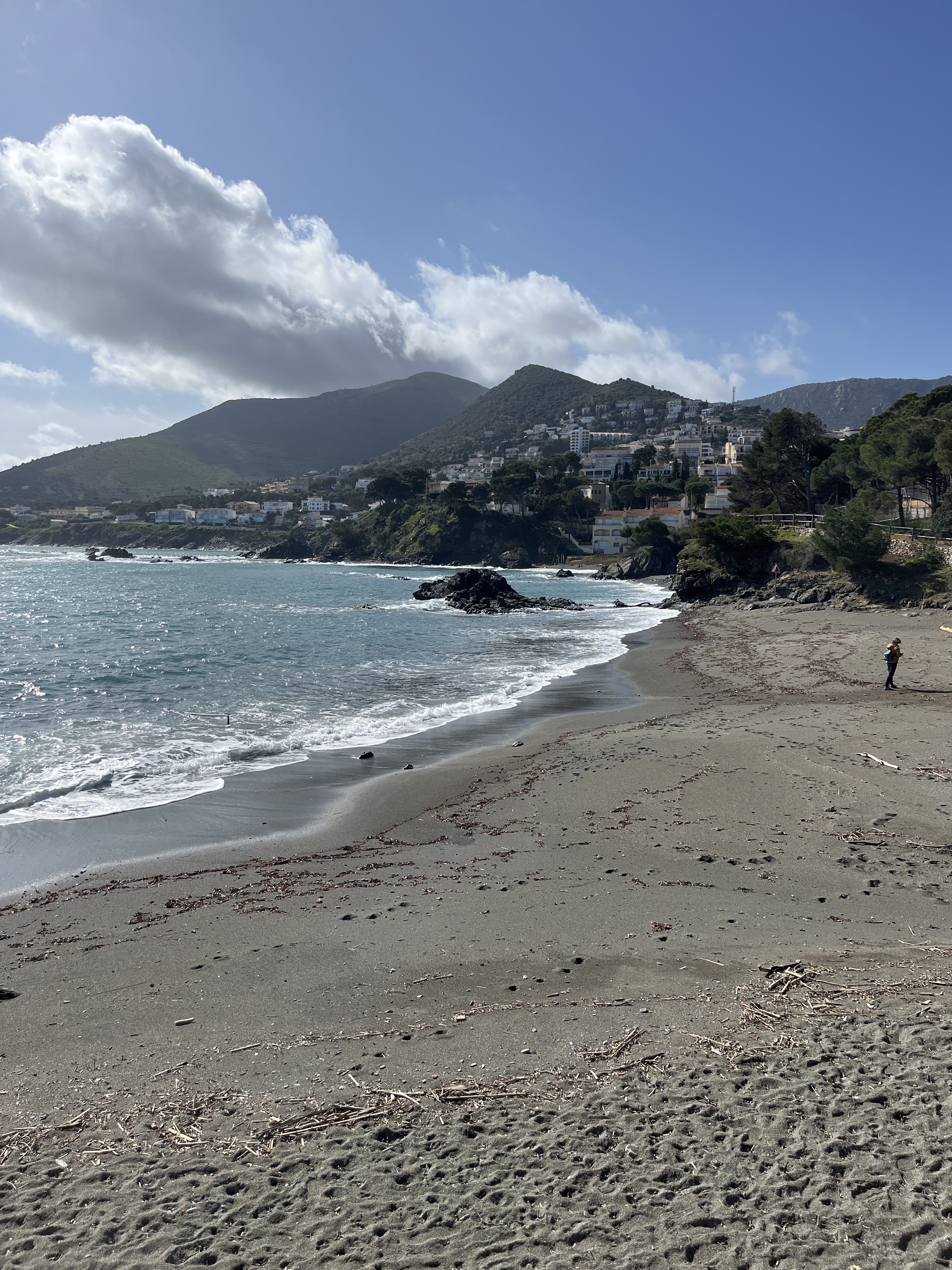 Vam resseguir el litoral, deixant el mar sempre a la nostra esquerra i vam passar per les platges de les Carboneres, l’Embarril, el Morer i les Titarolites, fins arribar a la platja de la Farella, una de les més destacades de Llançà i coneguda per estar resguardada de la tramuntana. En aquest punt, trobem un plafó informatiu de les arts de pesca 🎣 que s’hi practicaven. Se sospita que el nom de la platja prové del fet que s’hi practicava la pesca a l’encesa (les barques d’encerclament utilitzaven un llum per atraure el peix blau i capturar-lo) i que del terme “farell” en va derivar el nom de la platja de la Farella. Una cosa que ens va sobtar als quatre, és el color ennegrit de la sorra de les platges de Llançà.